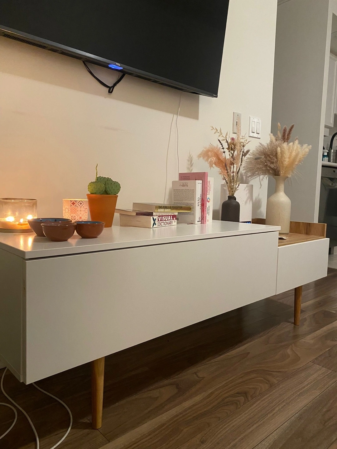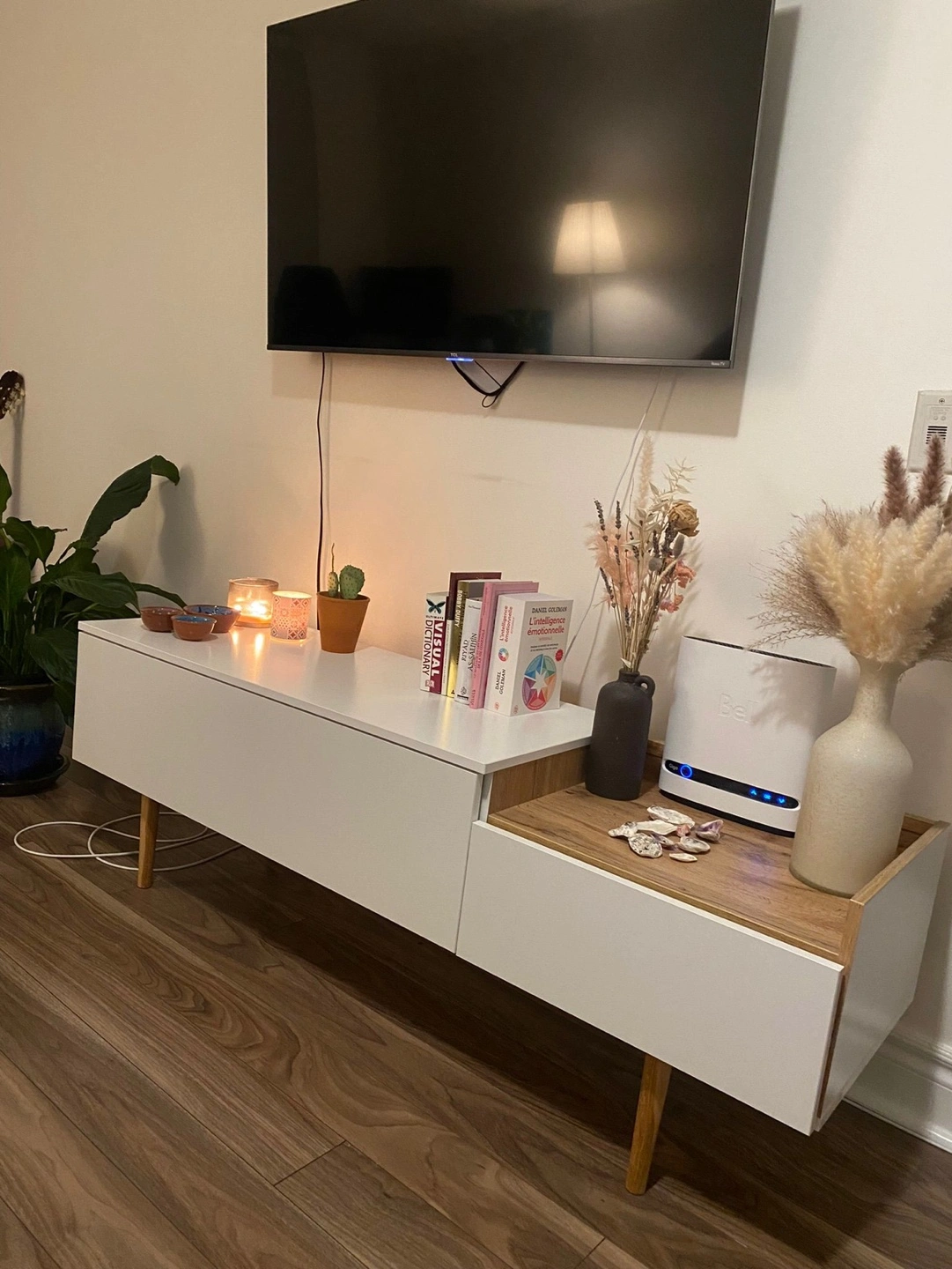 MOVING SALE - LEAVING THE COUNTRY SATURDAY White and light wood TV stand. Features one drawer and open shelving. Simple design, great for small spaces. Minimalist aesthetic.