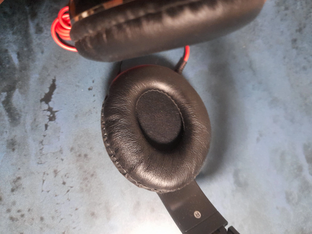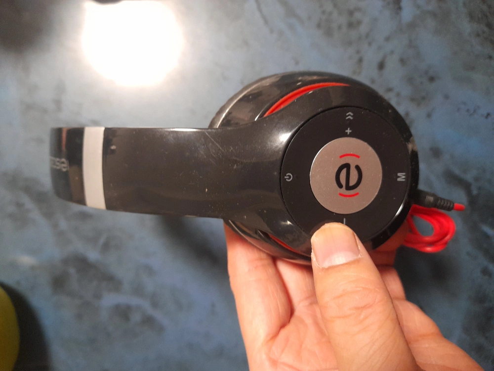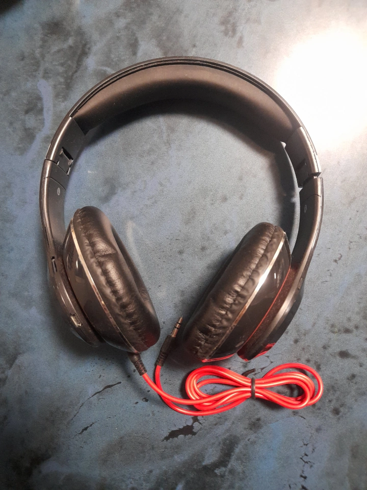 Wired over-ear headphones. Black with red accents. Volume control on earcup. Good for listening to music.