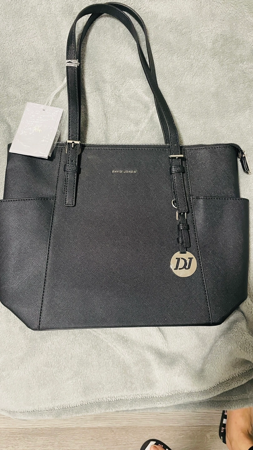 Black hand bag. Features zipper closure, two buckle straps, and an interior pocket. Good for everyday use. New with tags.