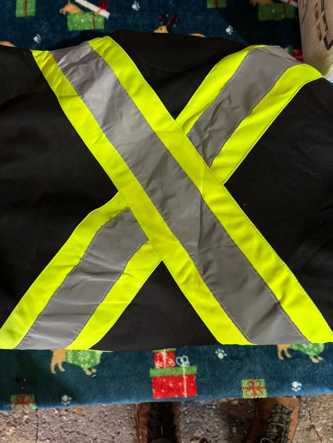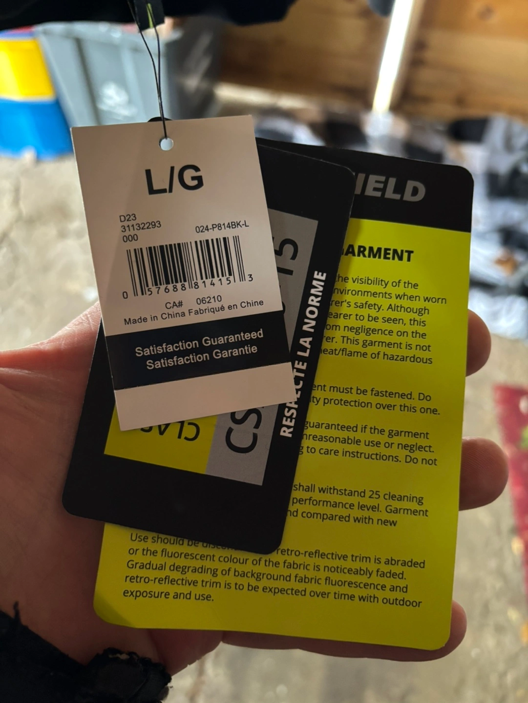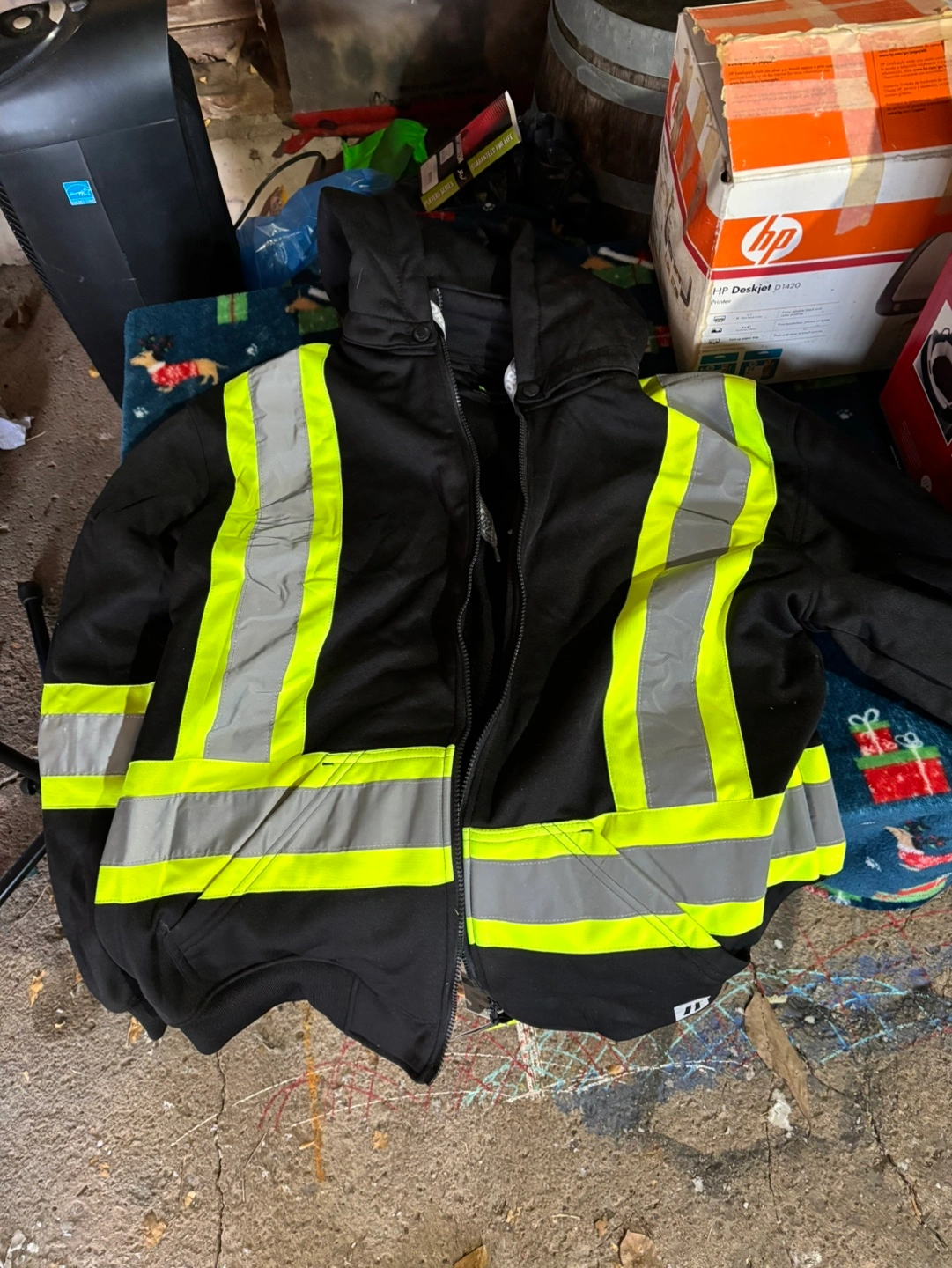 Men's black safety hoodie. Large size. Features bright yellow and silver reflective tape accents. Zipper closure and a hood.