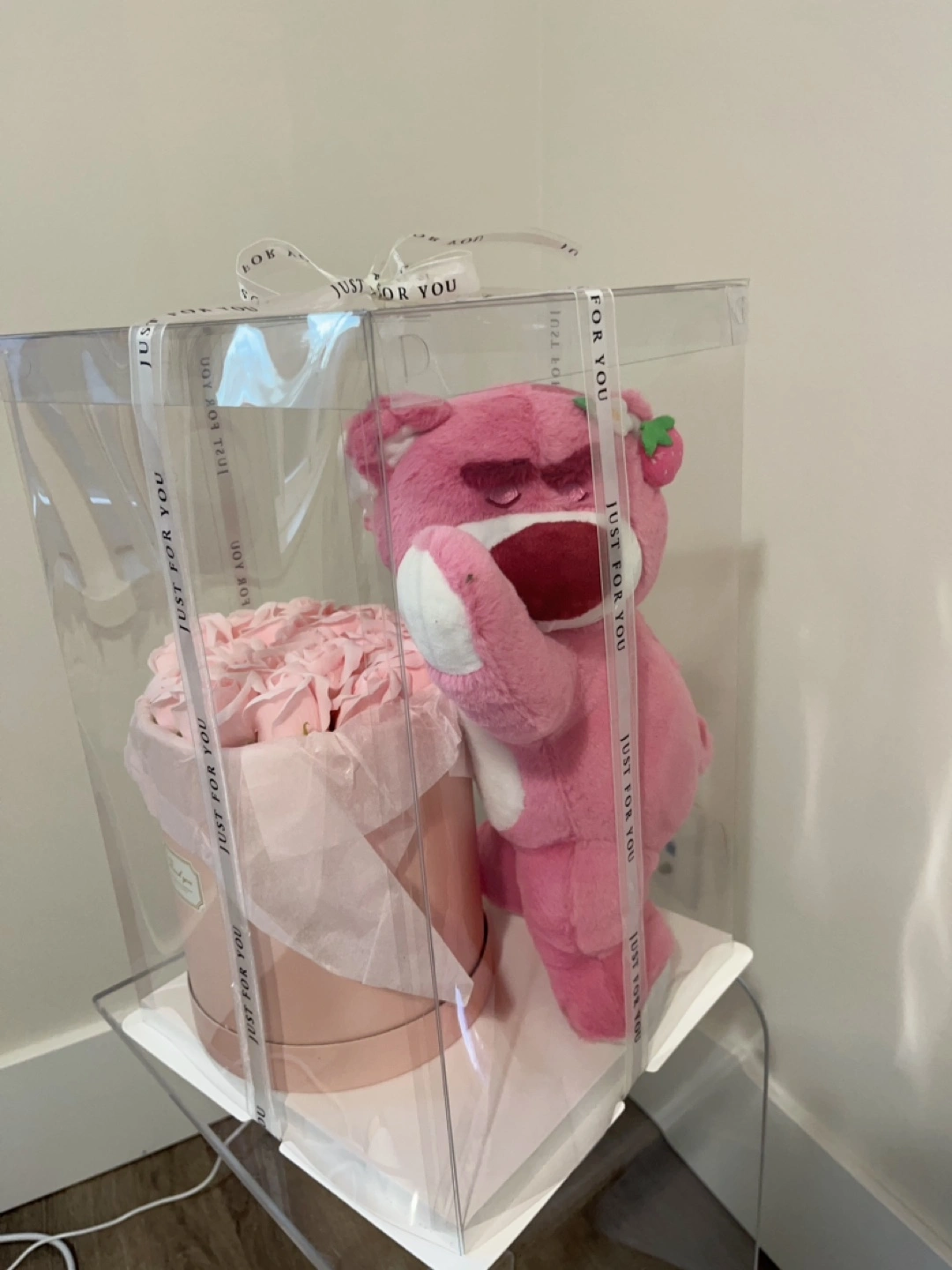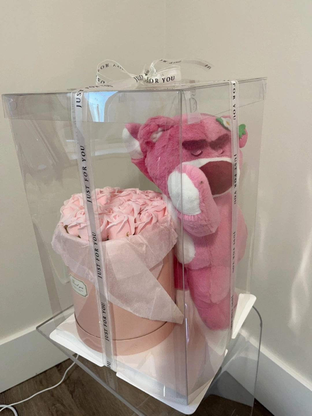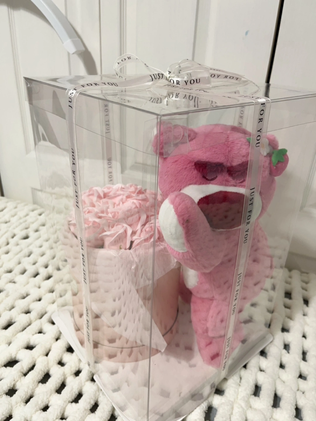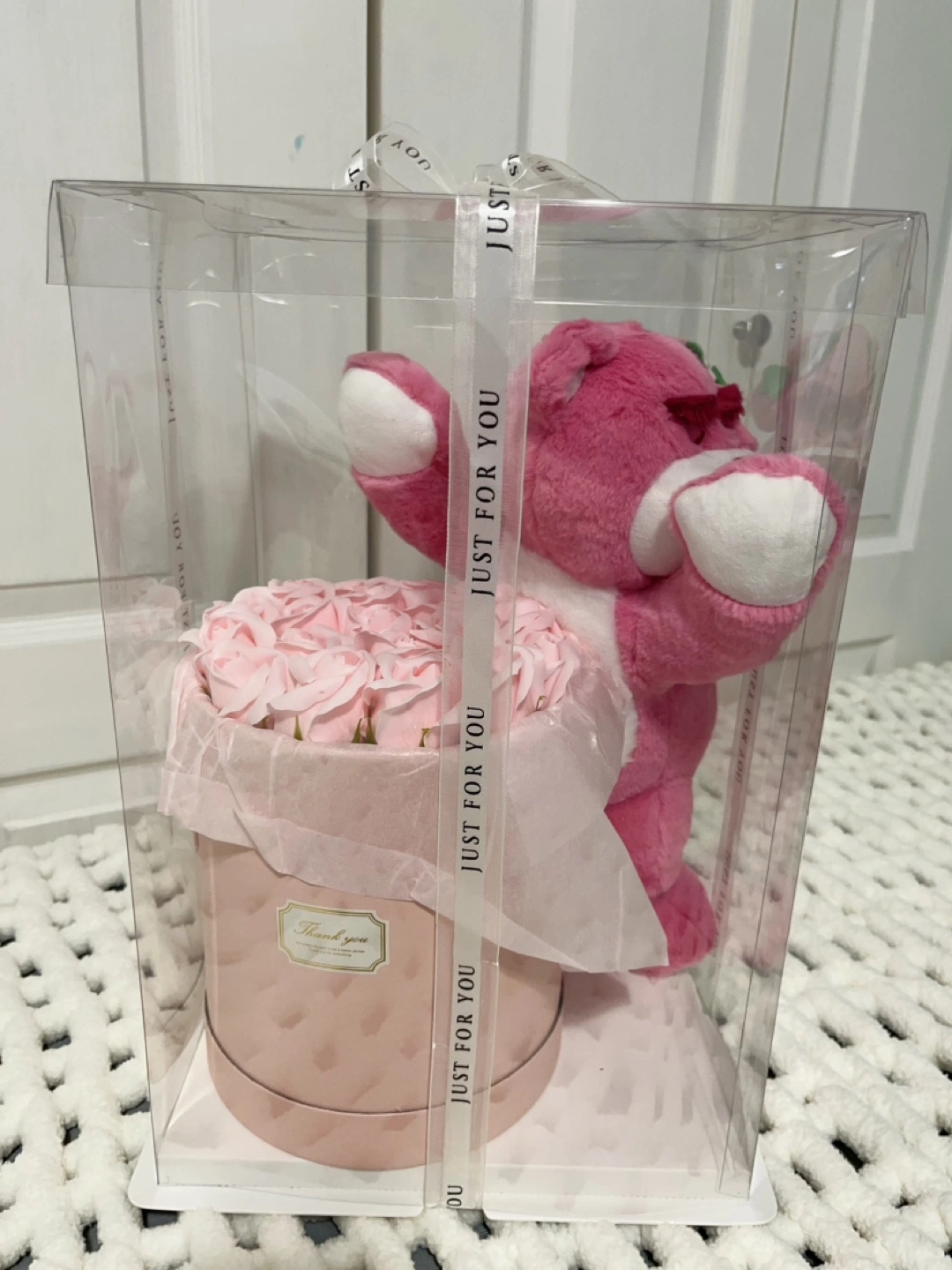 Adorable pink teddy bear and a box of pink roses. Perfect gift. Comes in a clear plastic container with ribbon. New, unused.