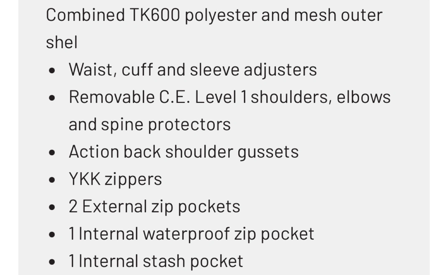 Men's or women’s black motorcycle jacket. Polyester and mesh outer shell. Removable armour. Waist, cuff and sleeve adjusters. Multiple pockets. YKK zippers. Excellent condition.