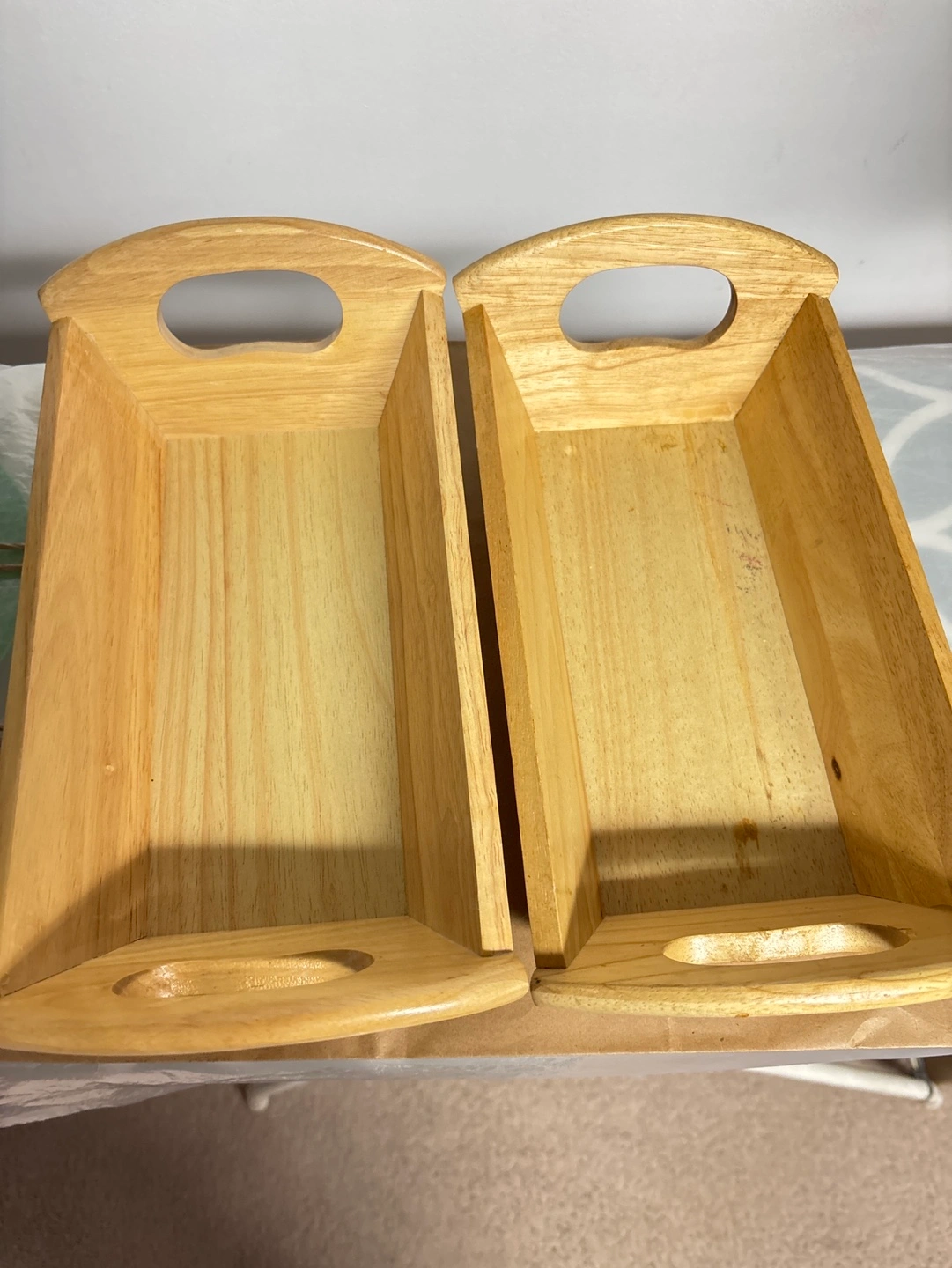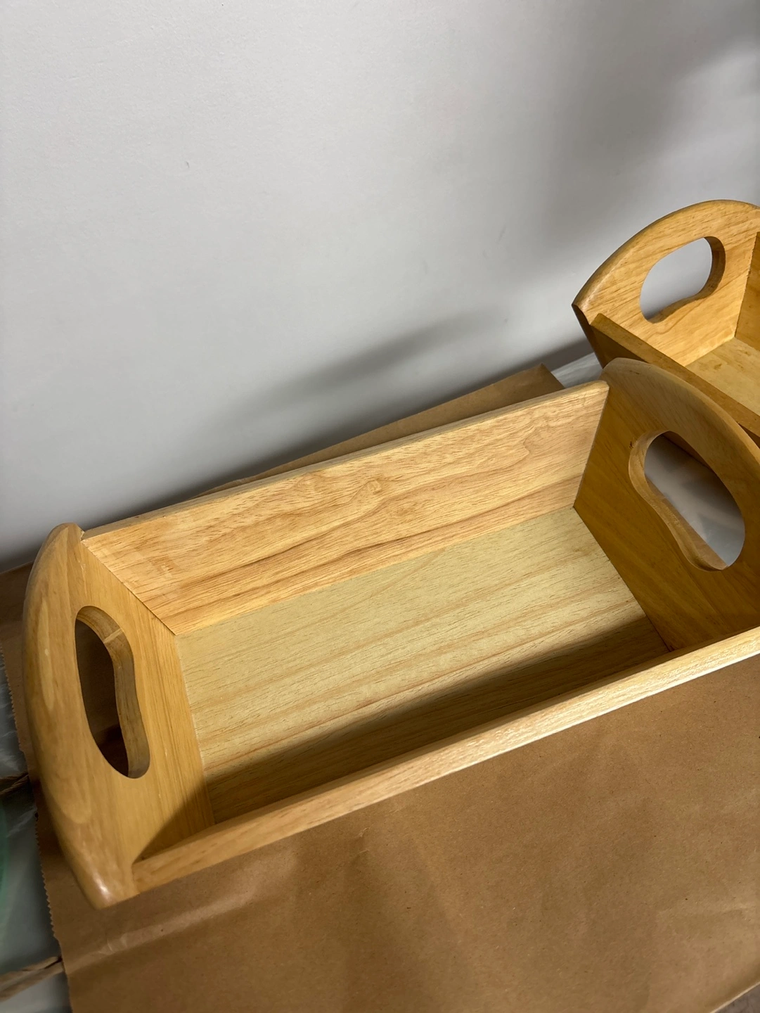 Two lovely wooden serving trays. Light coloured wood. Features two handles on each tray. Perfect for serving or organizing.