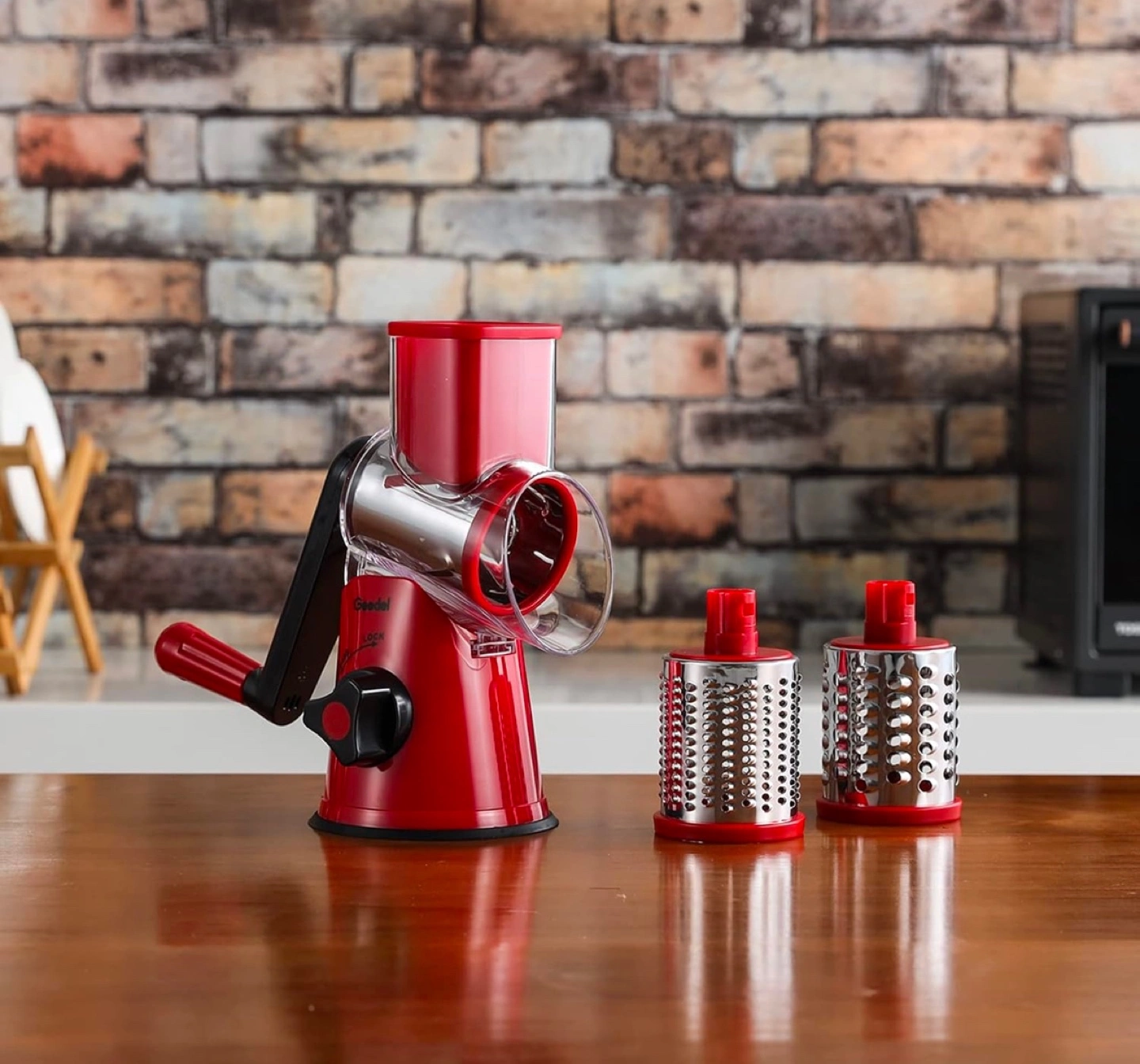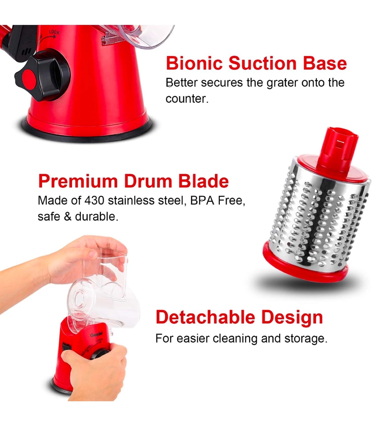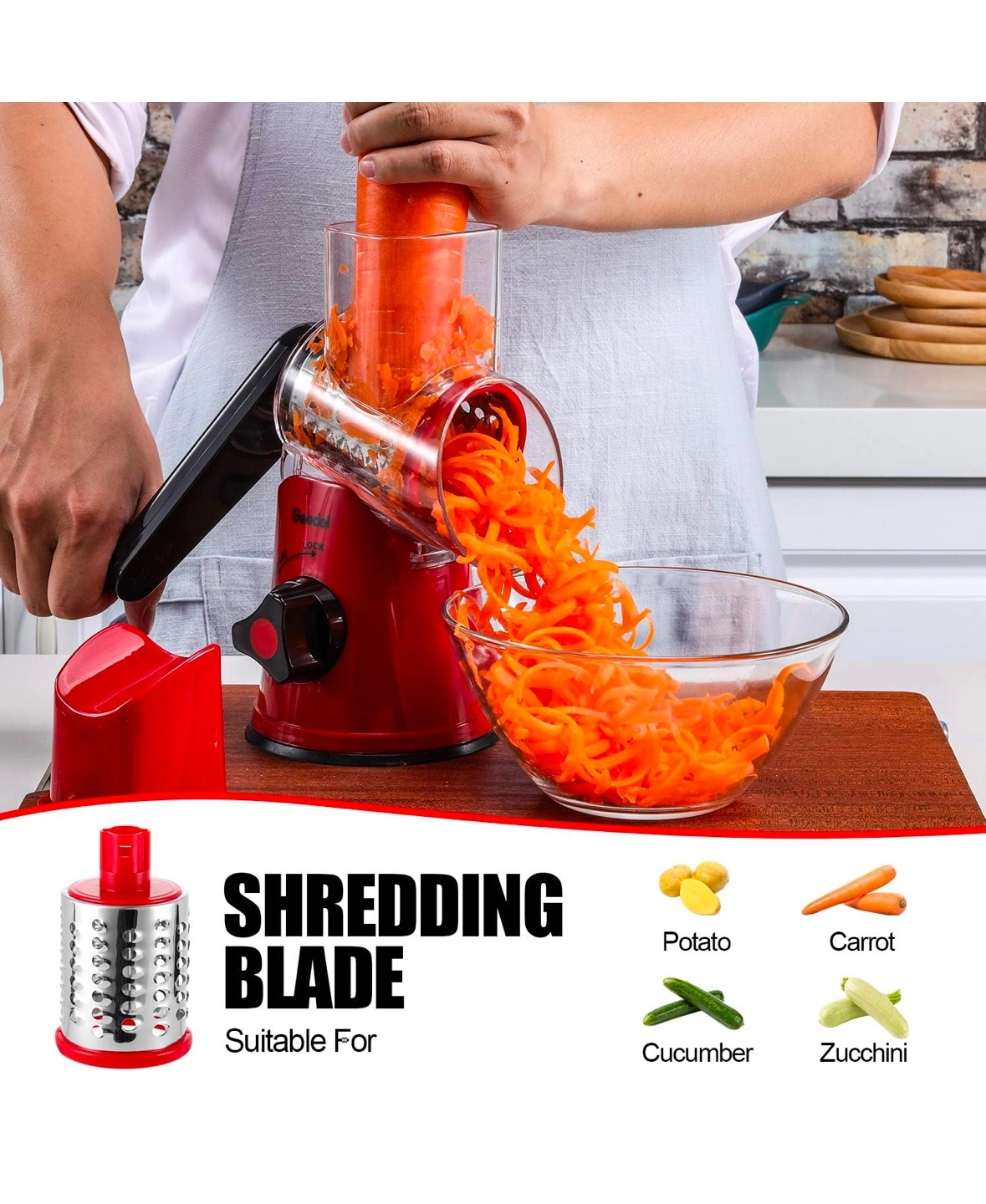 New Red rotary vegetable slicer. Three interchangeable blades: fine shredding, slicing, and shredding. BPA-free and made of 430 stainless steel. Features a suction base. Easy to clean and store.