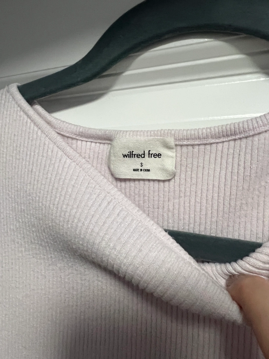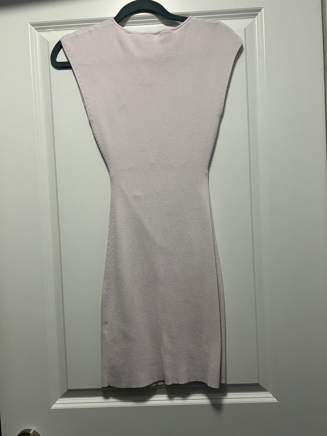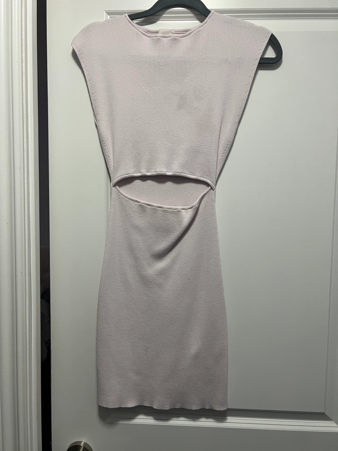 Light pink ribbed knit mini dress. Features a cutout at the waist. Short sleeves. Minor removable stain in the chest.