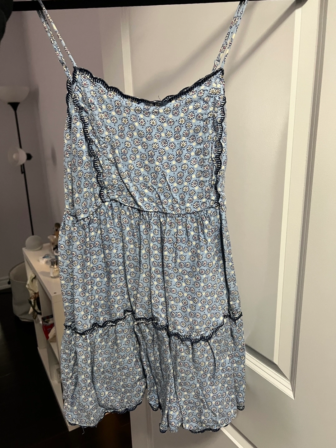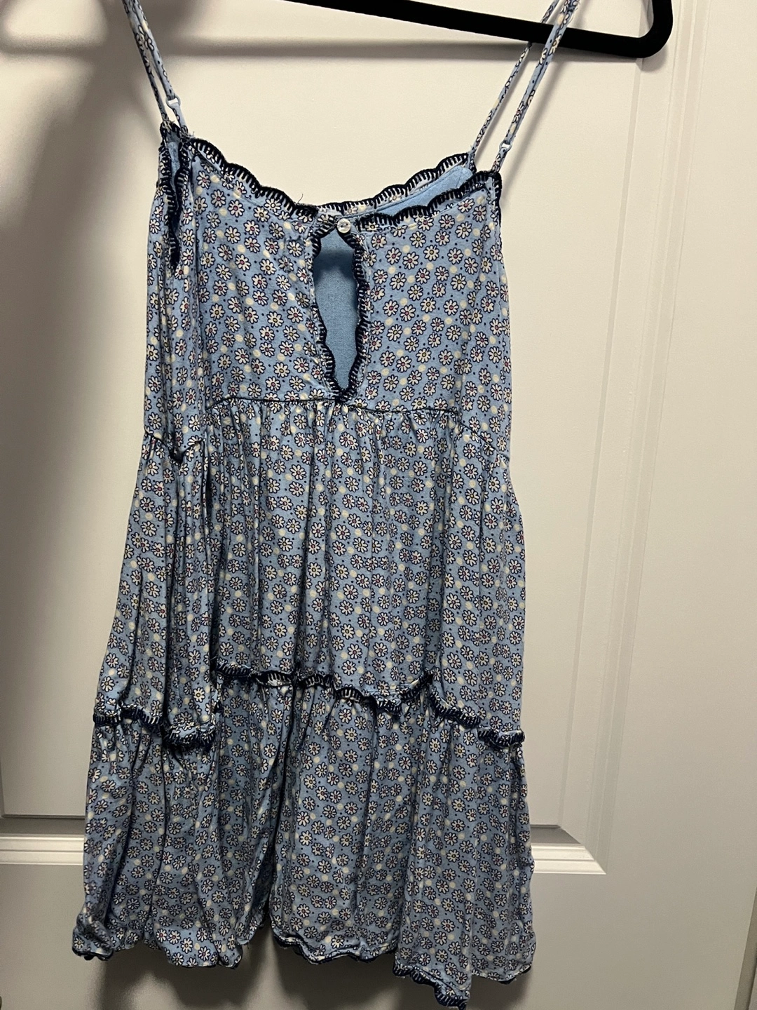 Cute mini dress, light blue floral pattern. Features thin straps and tiered skirt. Doll dress style. Scalloped trim detail. Size XS.