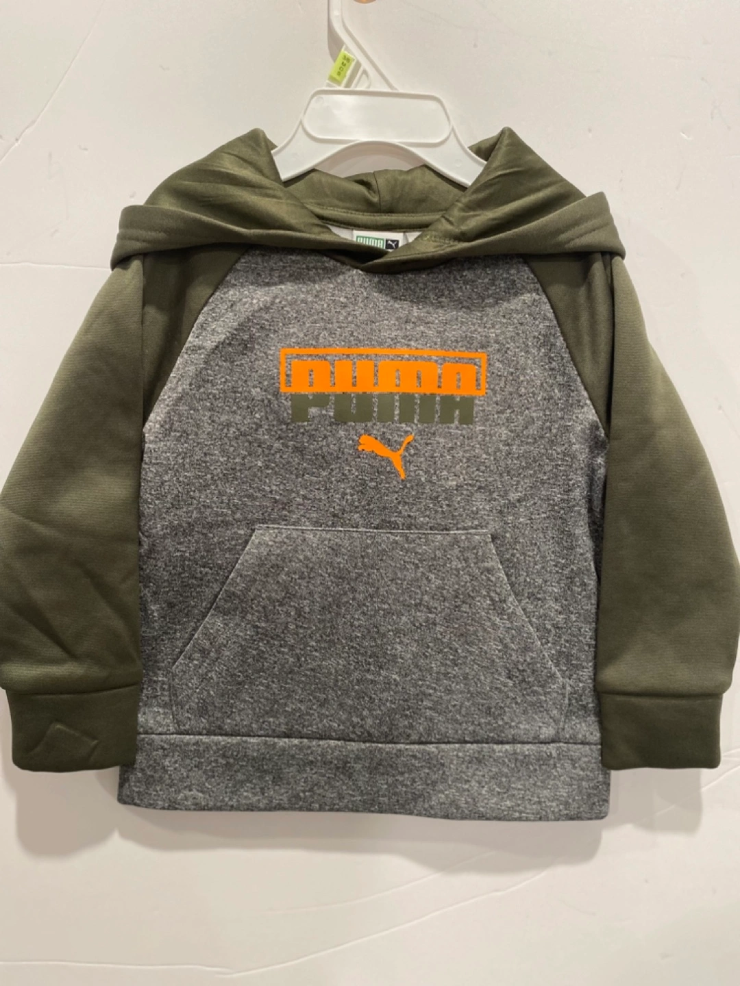 Lindo chándal infantil Puma de 2 piezas. Verde oliva y gris. Talla 18M. Sudadera con capucha y pantalón jogger. Nuevo con las etiquetas.