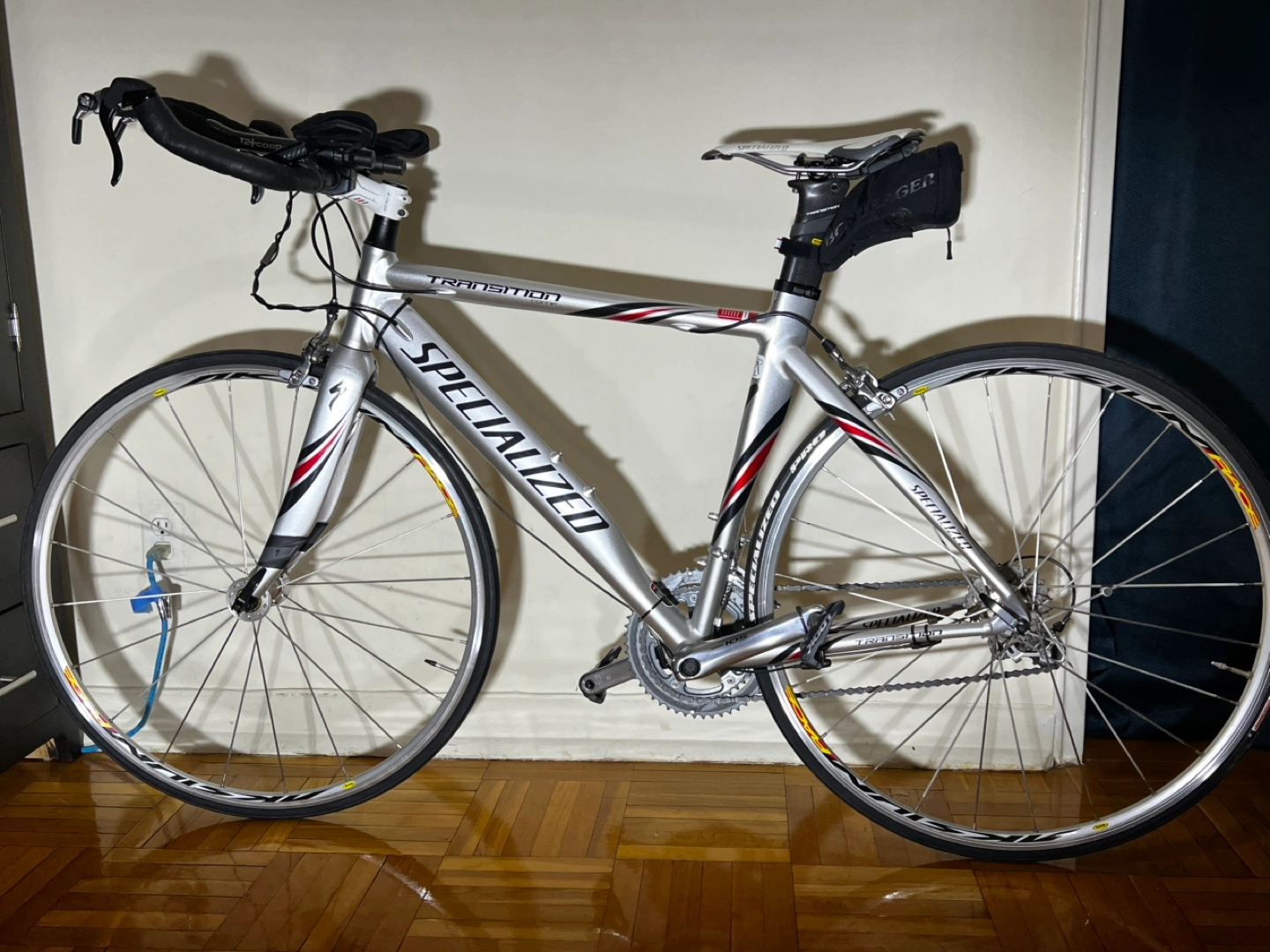 Specialized Transition triathlon bike. Includes Profile Design T2+ Cobra carbon fibre handlebars and KEO Classic pedals. Mavic Aksium Race wheels. Shimano 105 components. Great for racing or training.