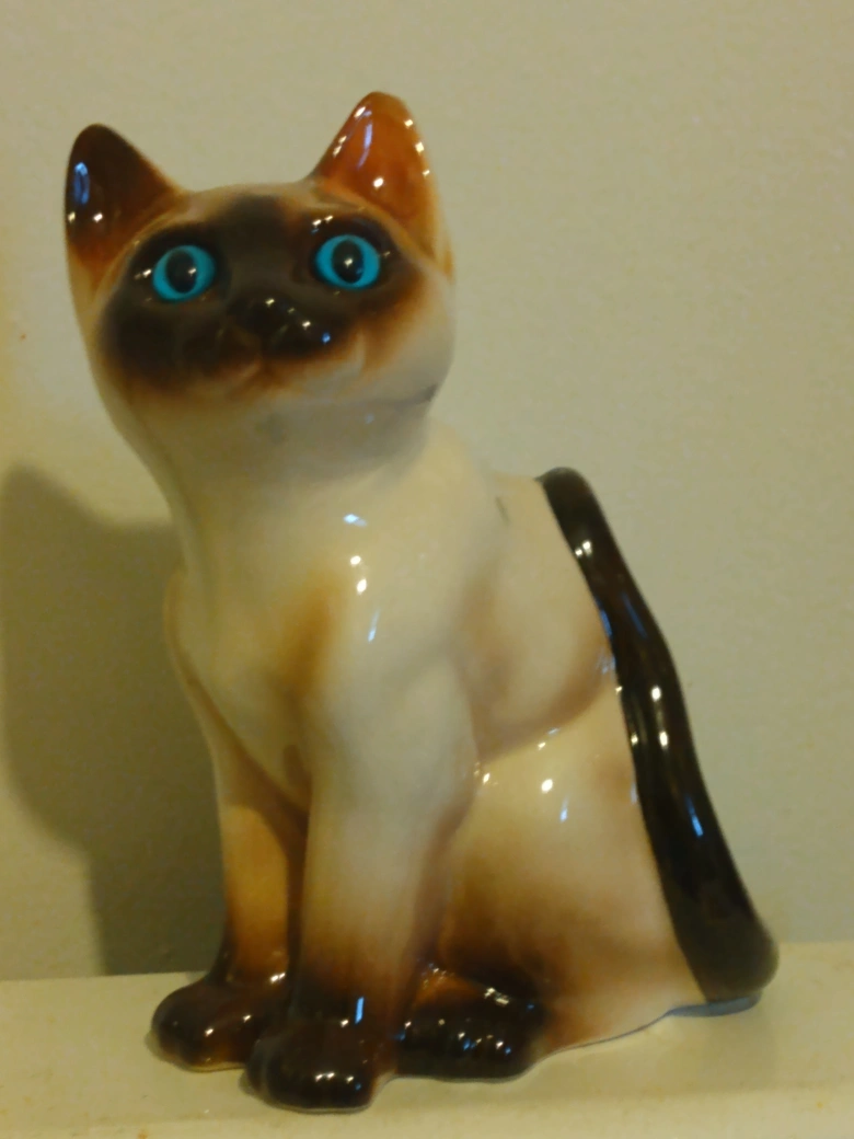 Adorable vintage ceramic Siamese cat figurine. Features bright blue eyes and a glossy finish. Perfect for cat lovers or collectors.