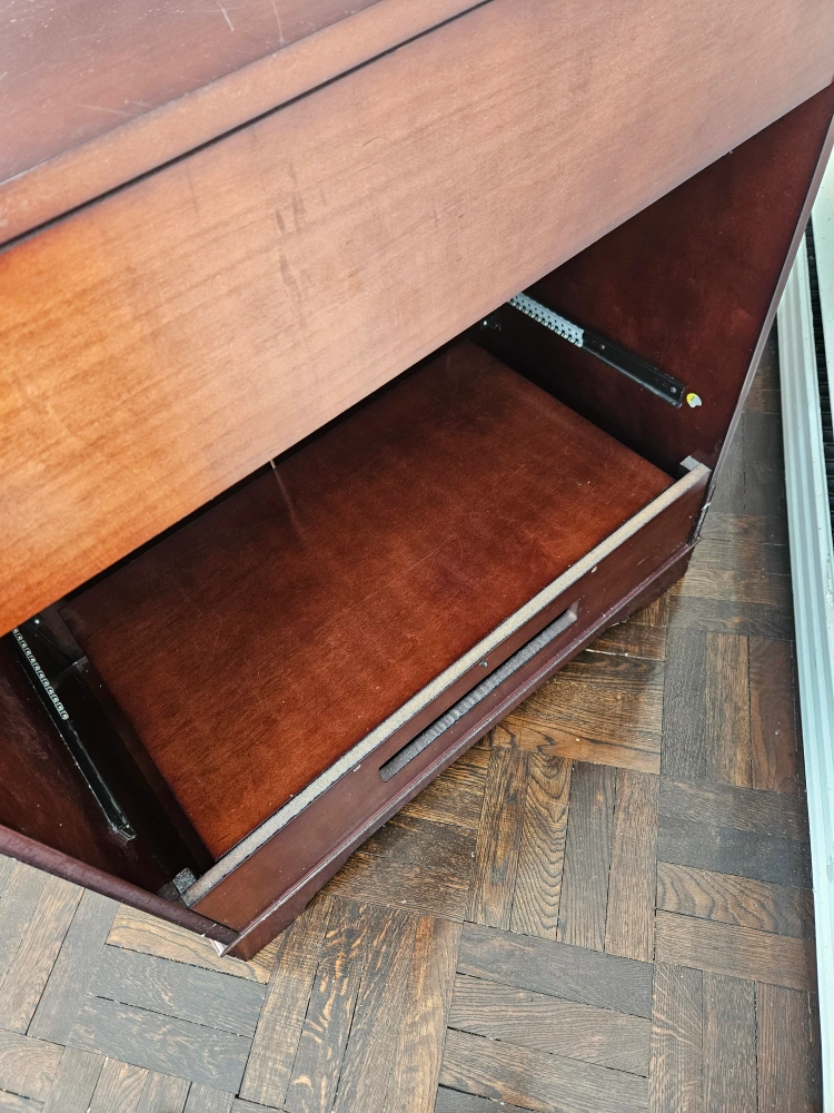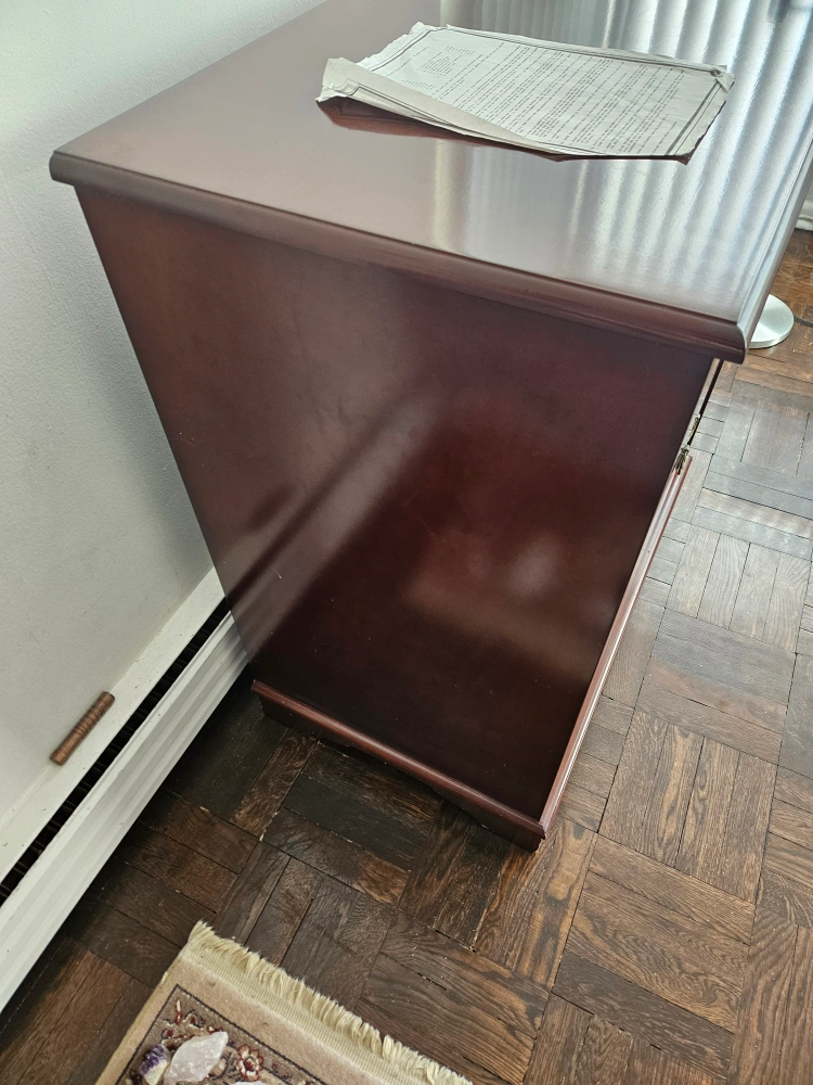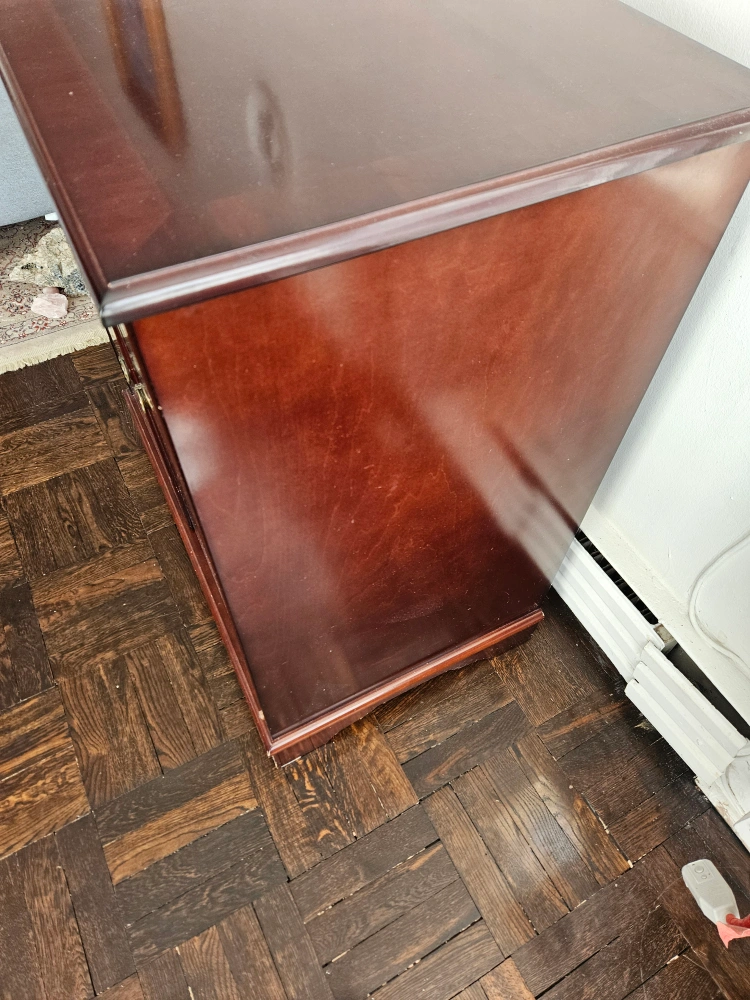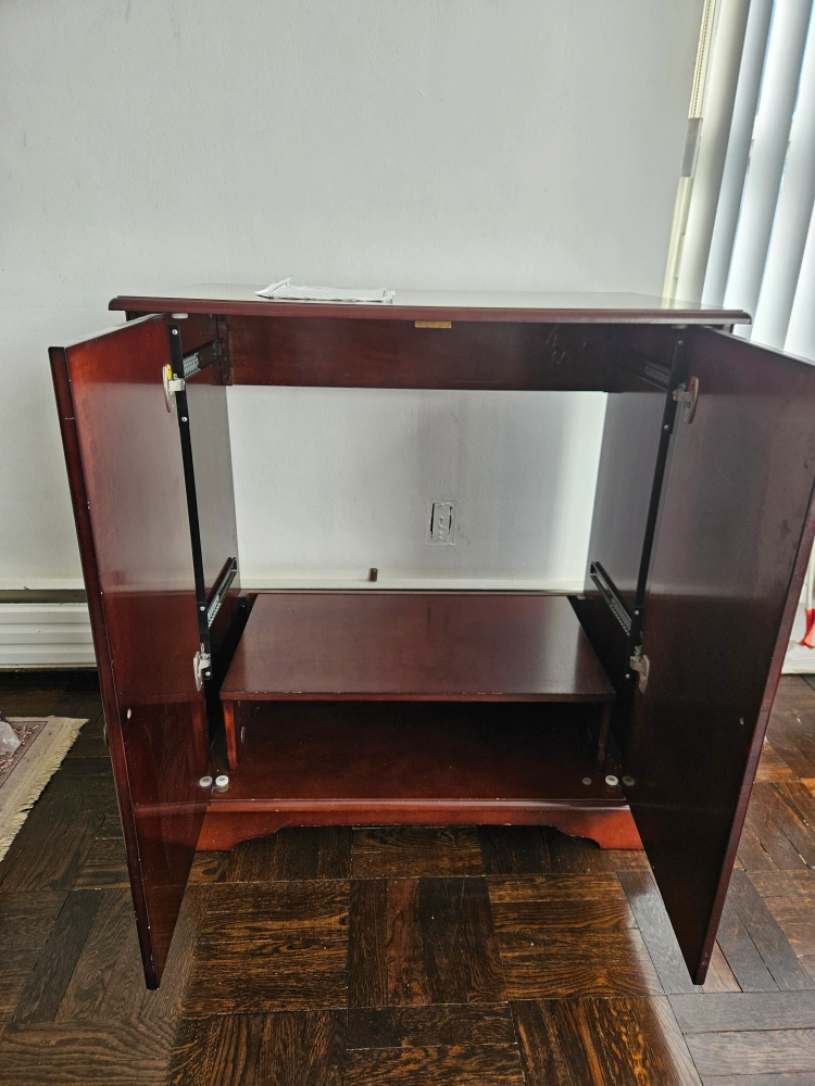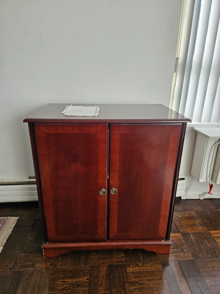lovely dark cherry wood wooden cabinet. Two doors open to reveal a shelf. Dark cherry finish. Suitable for storage or media console. It was purchased from the Bombay Company and it is called "The entertainment cabinet""