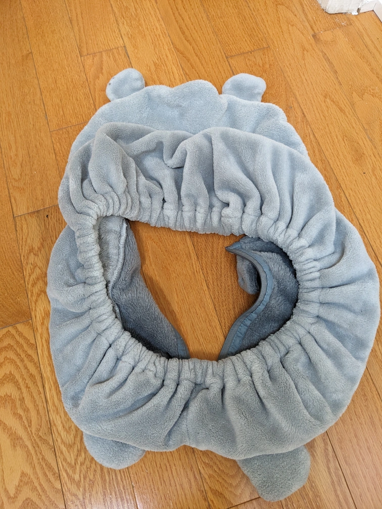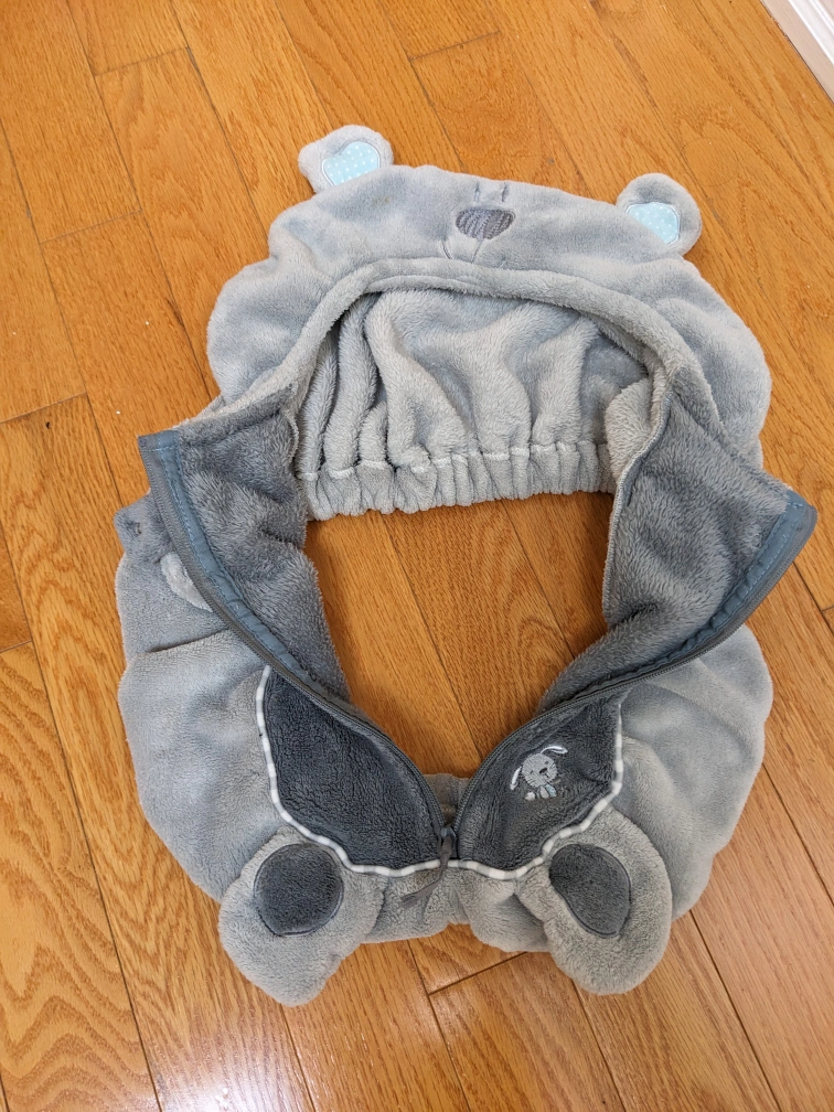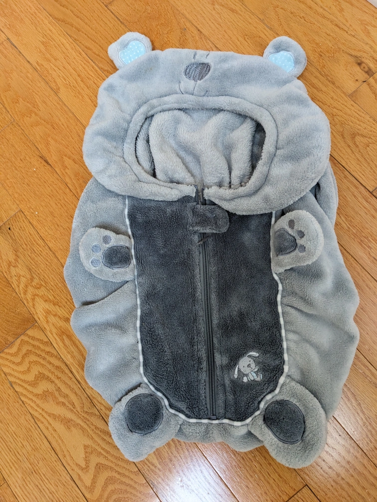 1000+Adorable car seat cover, grey and plush. Features a bear hood and paws. Zipper closure. Cozy and warm.