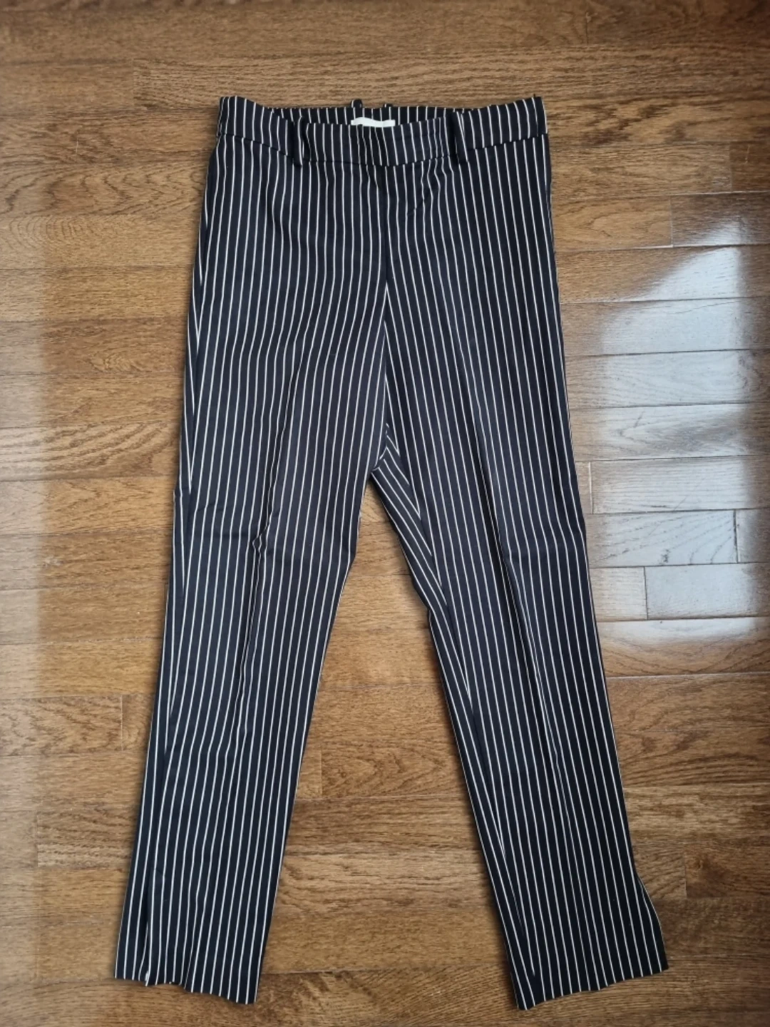 Women's pinstripe trousers. Dark navy blue with thin white stripes. Straight leg. Size 8. Pockets. Slit on the bottom side of the legs.