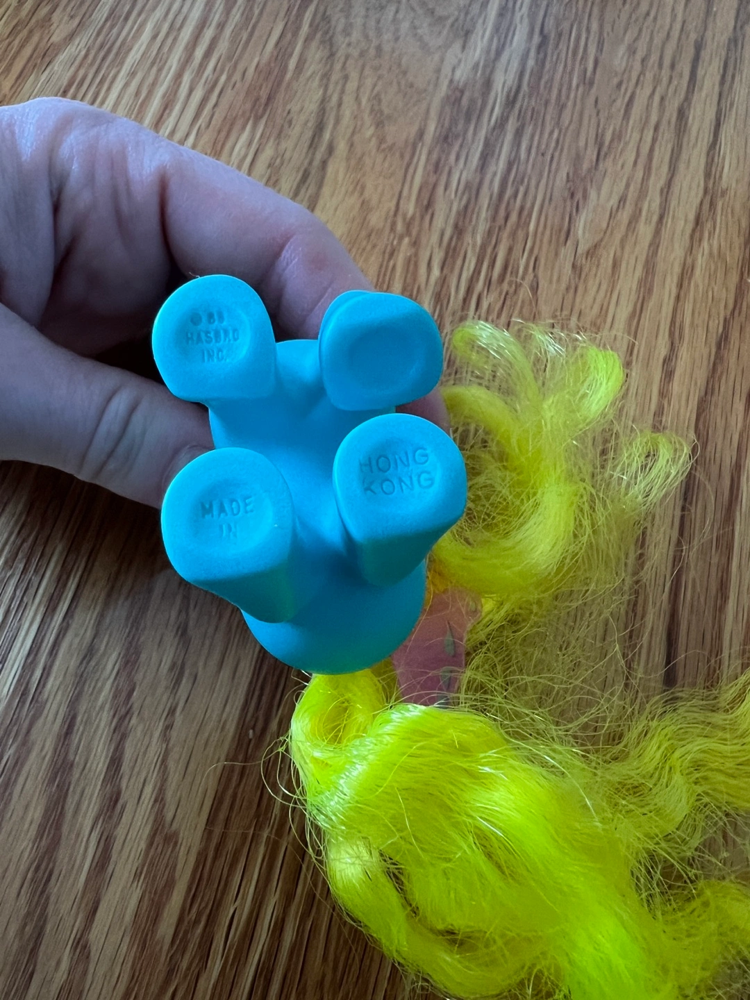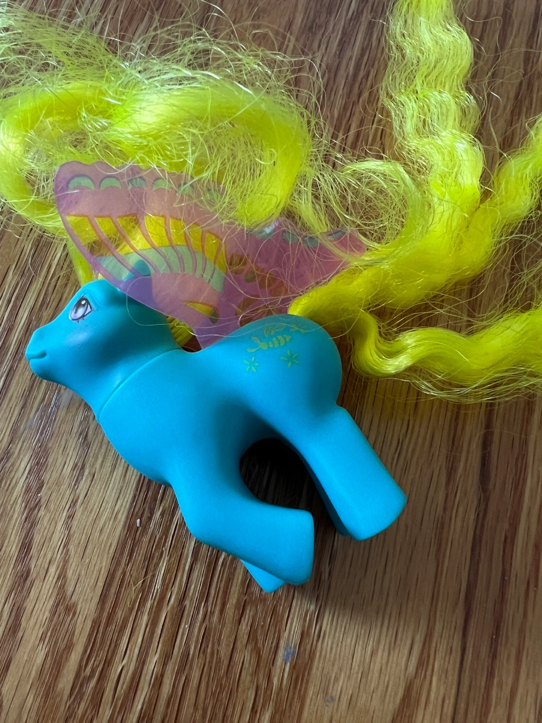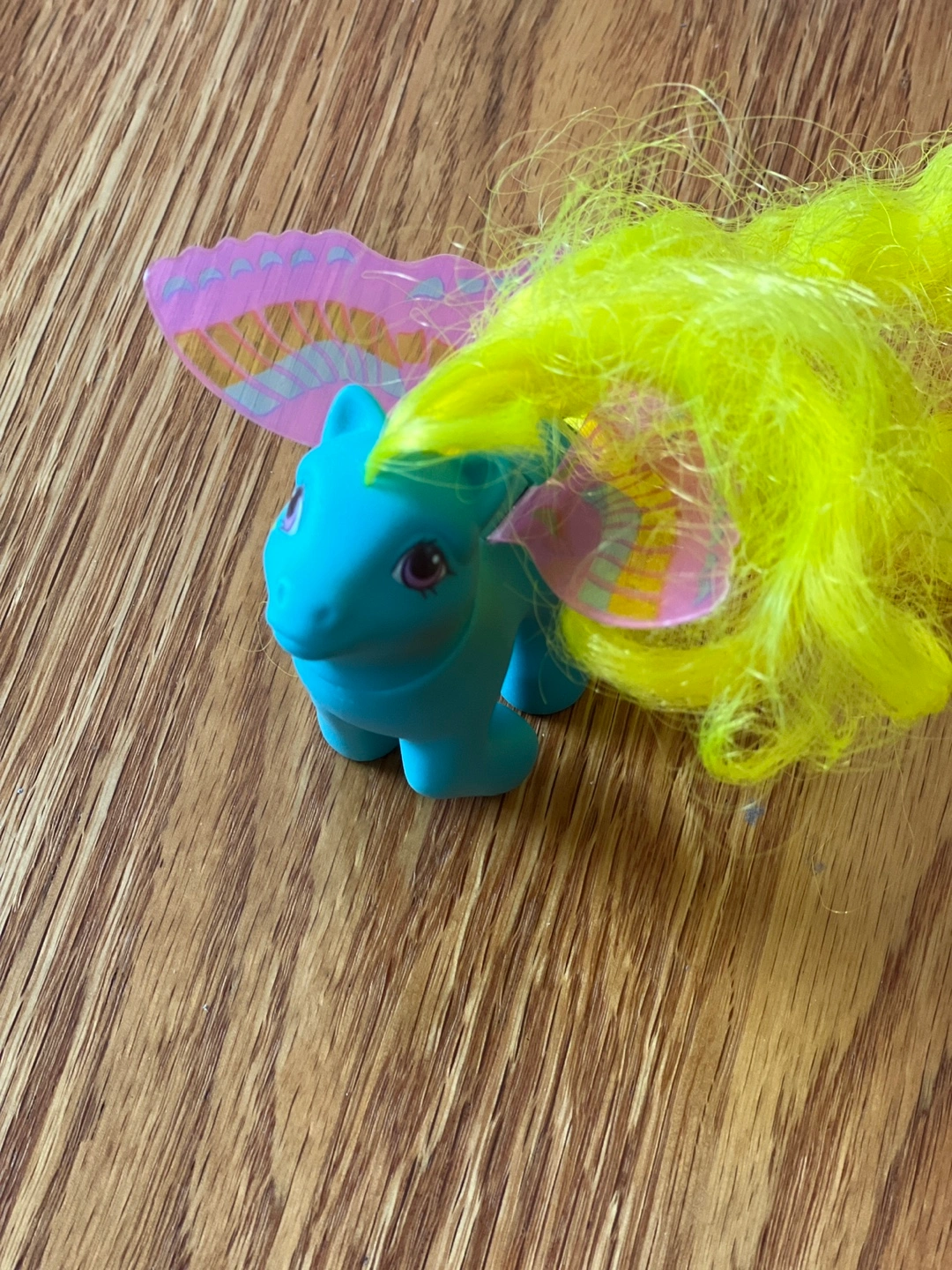 Adorable vintage My Little Pony figure. Light blue body, bright yellow hair, and colourful butterfly wings. Made in Hong Kong. Collectible toy.