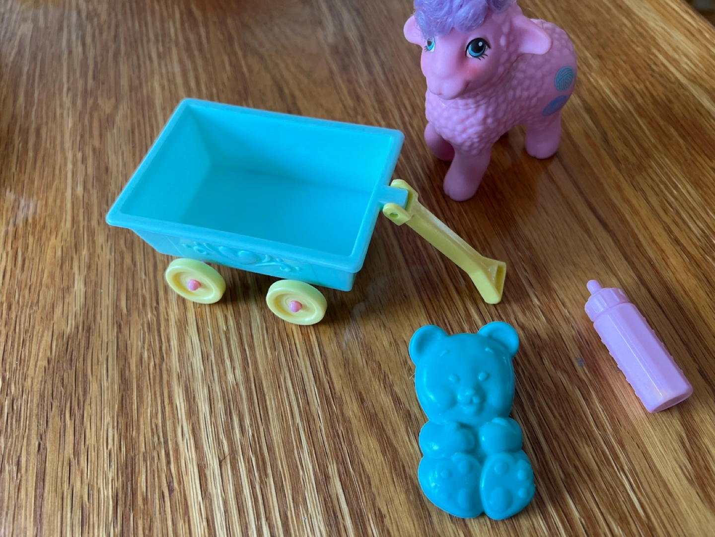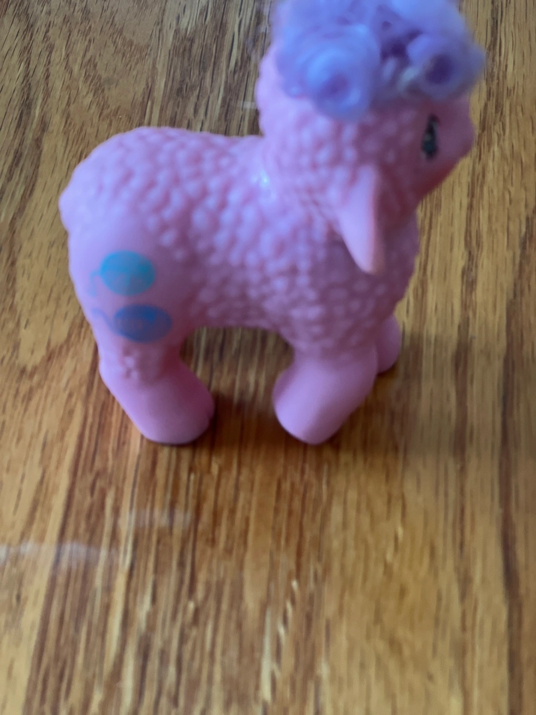 Pink body with purple hair and blue eyes Symbol Aqua and blue balls of yarn