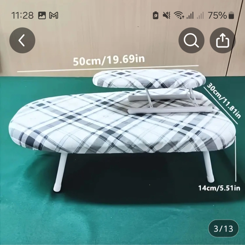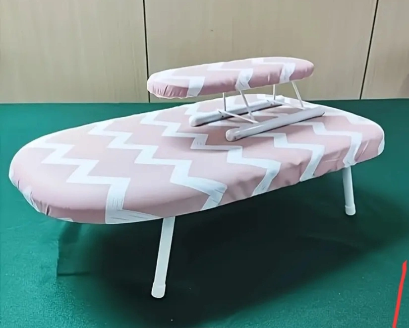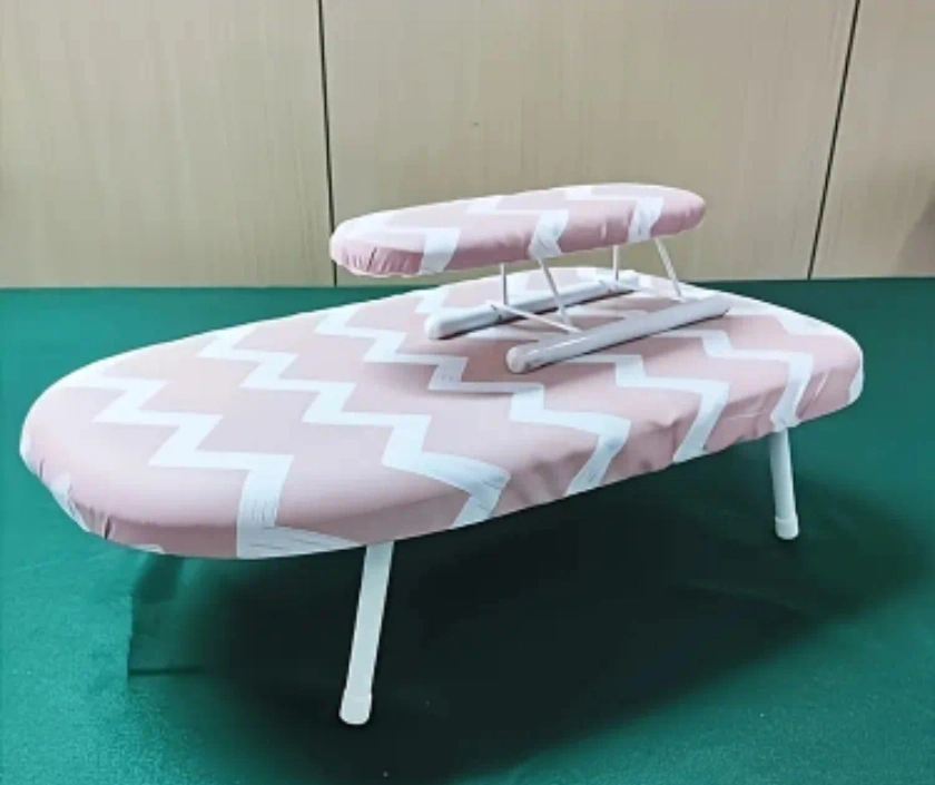 Small ironing board, pink and white chevron pattern. Includes a smaller attached sleeve board. Foldable legs. Perfect for small spaces or travel.