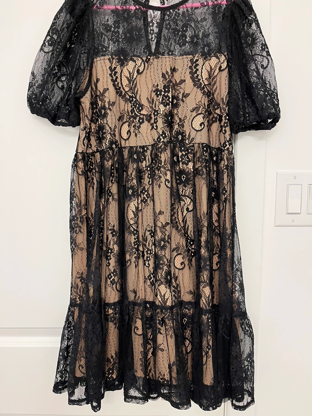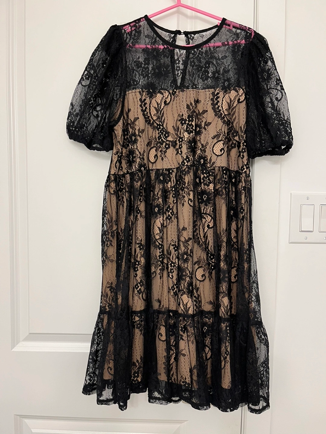 Beautiful black lace mini dress. Features puff sleeves and tiered skirt. Bronze -lined bodice. Perfect for a special occasion.