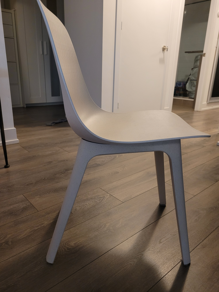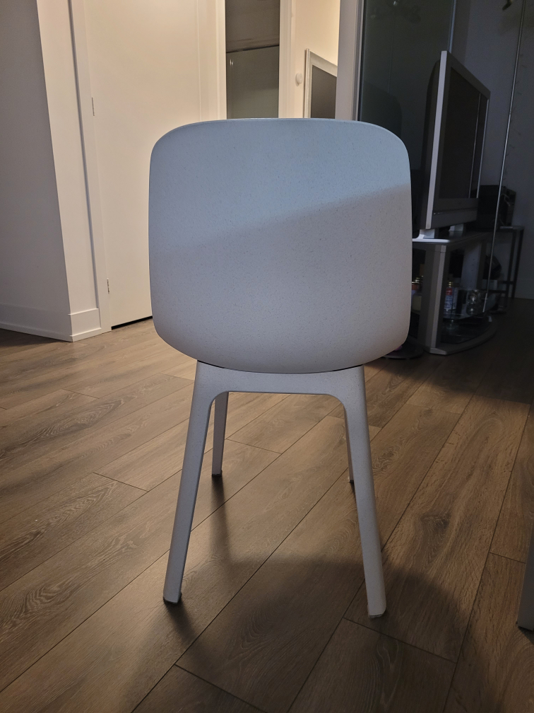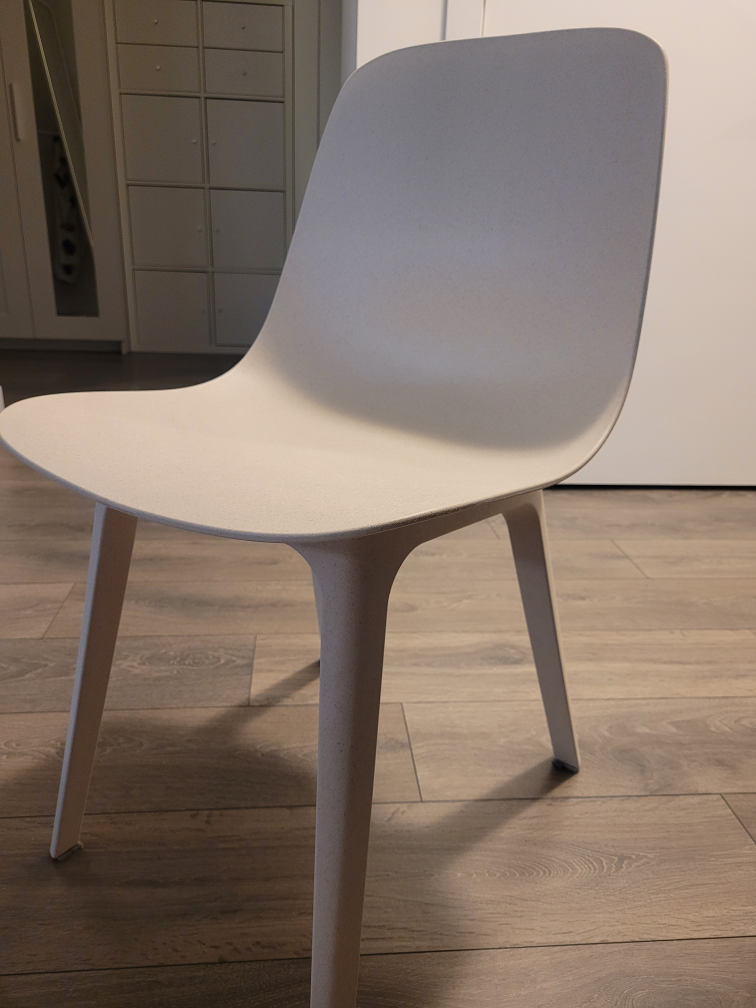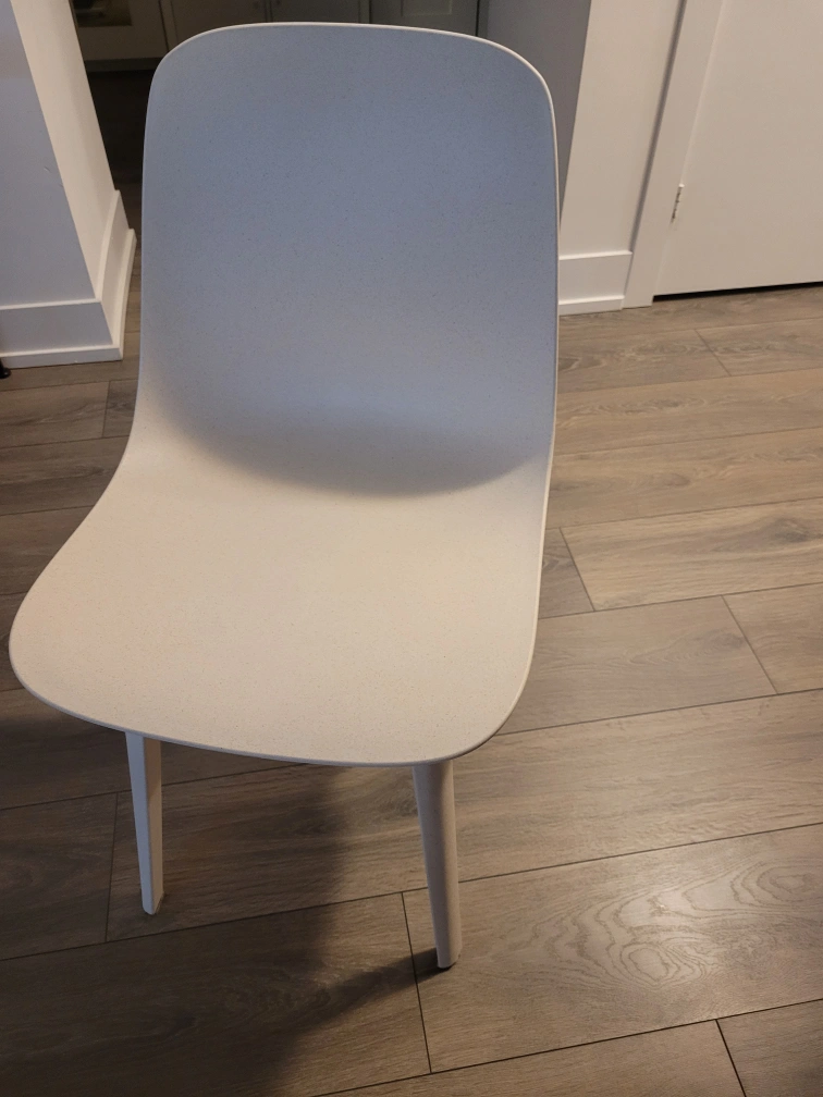 Modern off-white plastic chair. Simple design, four legs. Suitable for dining room or kitchen.