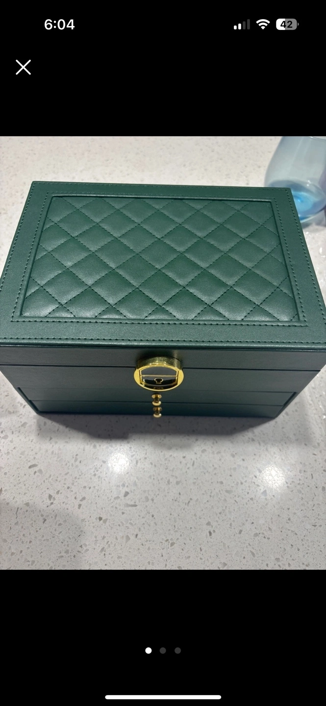 Brand new Available 3 color (white,green,black) Three-layer jewellery box. Dark green quilted exterior. Multiple compartments for rings, earrings, necklaces, and bracelets. Gold-toned hardware. Excellent for storing and organizing jewellery.
