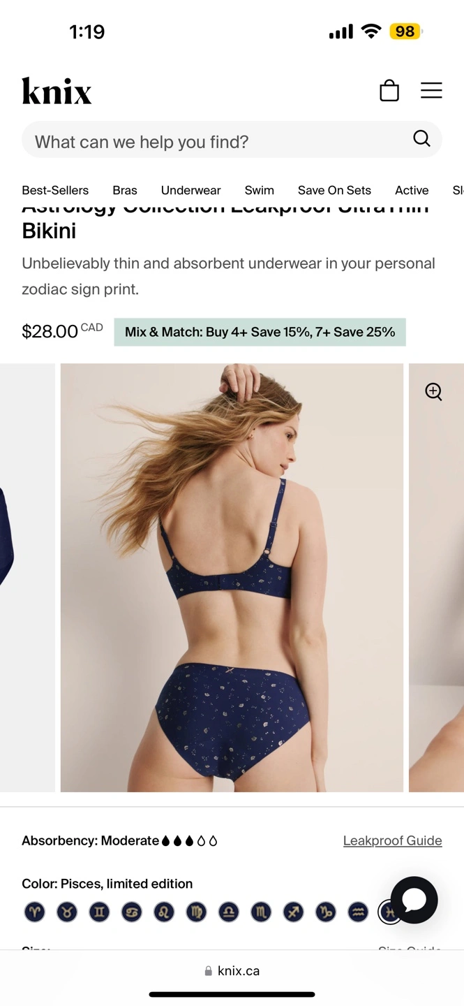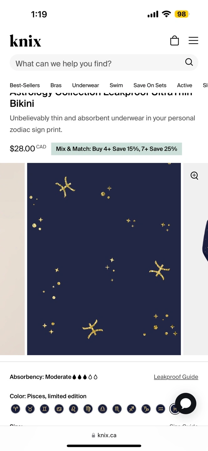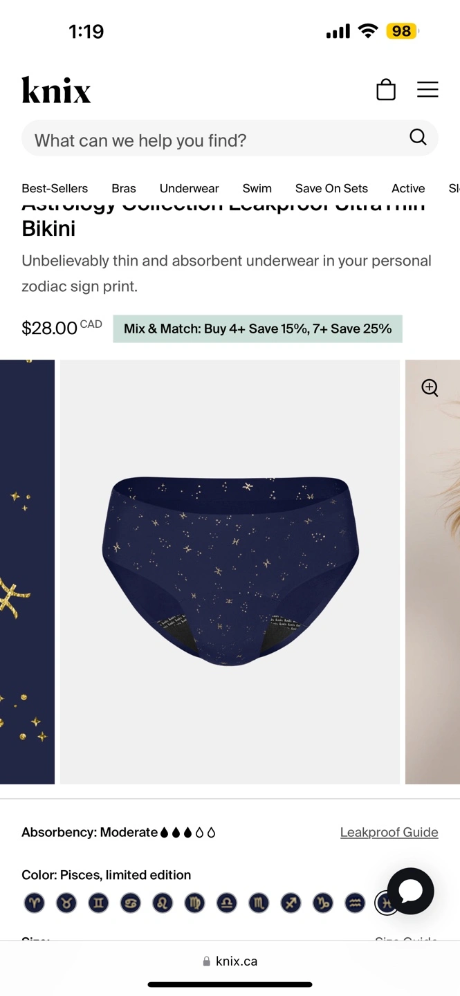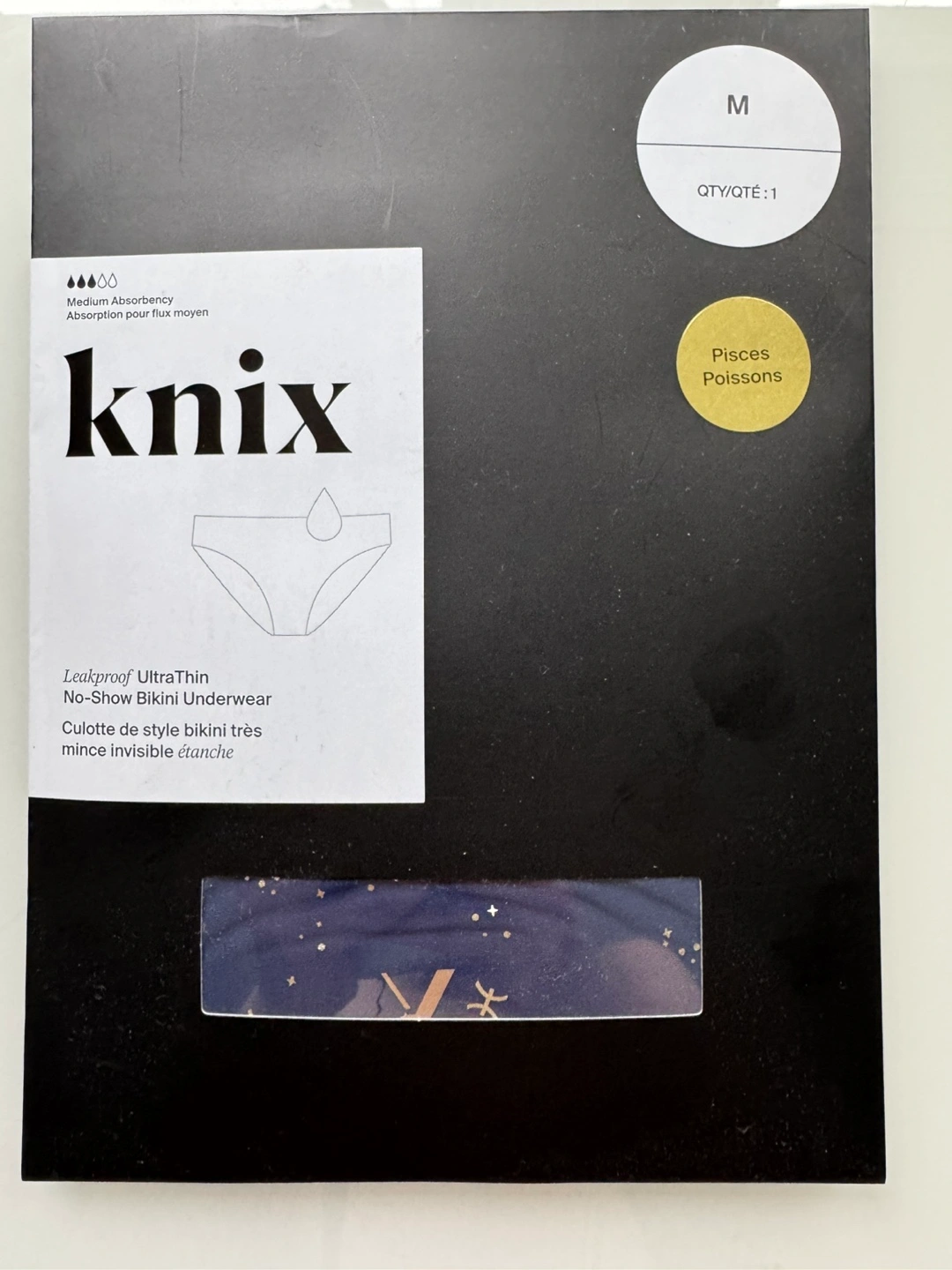 1000+Knix leakproof underwear - Pisces zodiac print. The very latest in leakproof innovation – get more absorbency without any extra bulk! Features an ultra-thin liner that absorbs the same as about 2.5 super tampons, and 360LeakSeal™ technology that locks in leaks at every edge. You get the protection you want from periods and light bladder leaks, so you can feel super comfy and worry-free every single day of the month.