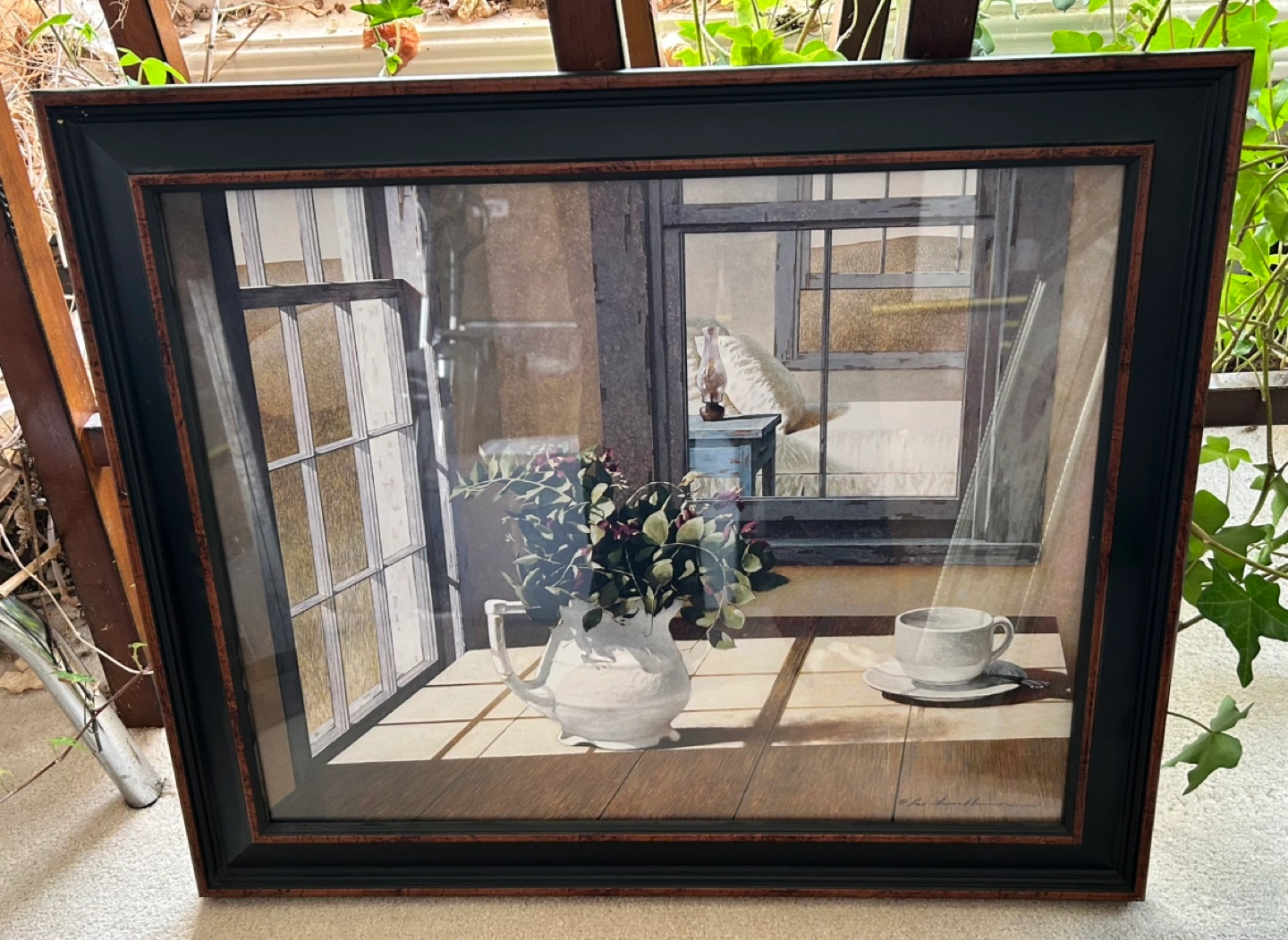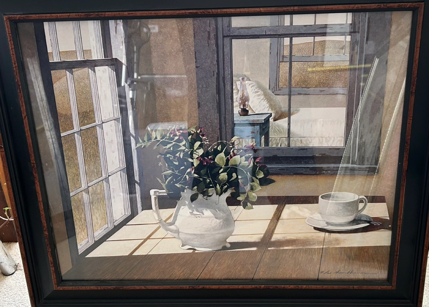 310Beautiful framed art print. Depicts a sunlit room with a window, flowers in a pitcher, and a cup and saucer. Black frame with a brown inner border. Artist's signature visible. 24”X 19”. Any nicks on the frame can easily be touched up with a marker. Pick up location Northeast Burlington Intersection Appleby line and Dundas Contact for porch pick up Smoke free home 😊