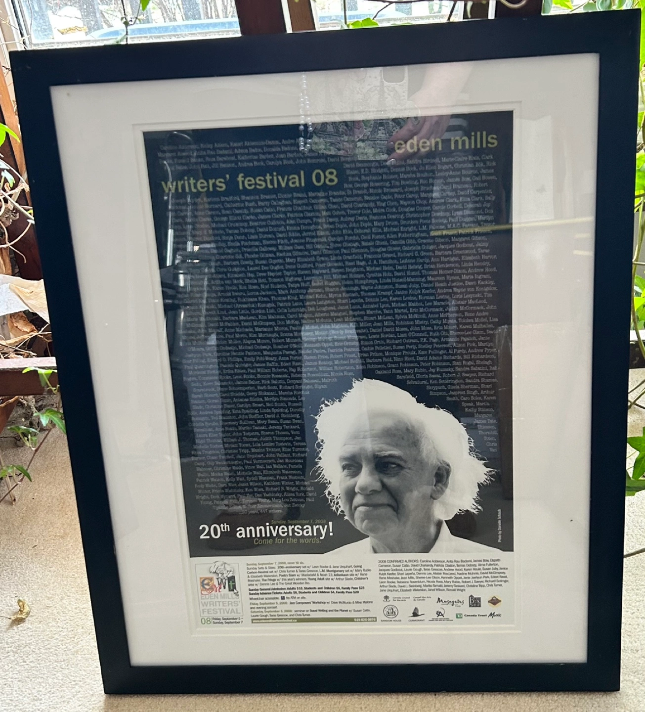 Black framed poster featuring the 20th anniversary of the Eden Mills Writers Festival. Includes a list of authors and event details. Good condition. 18”X 22”