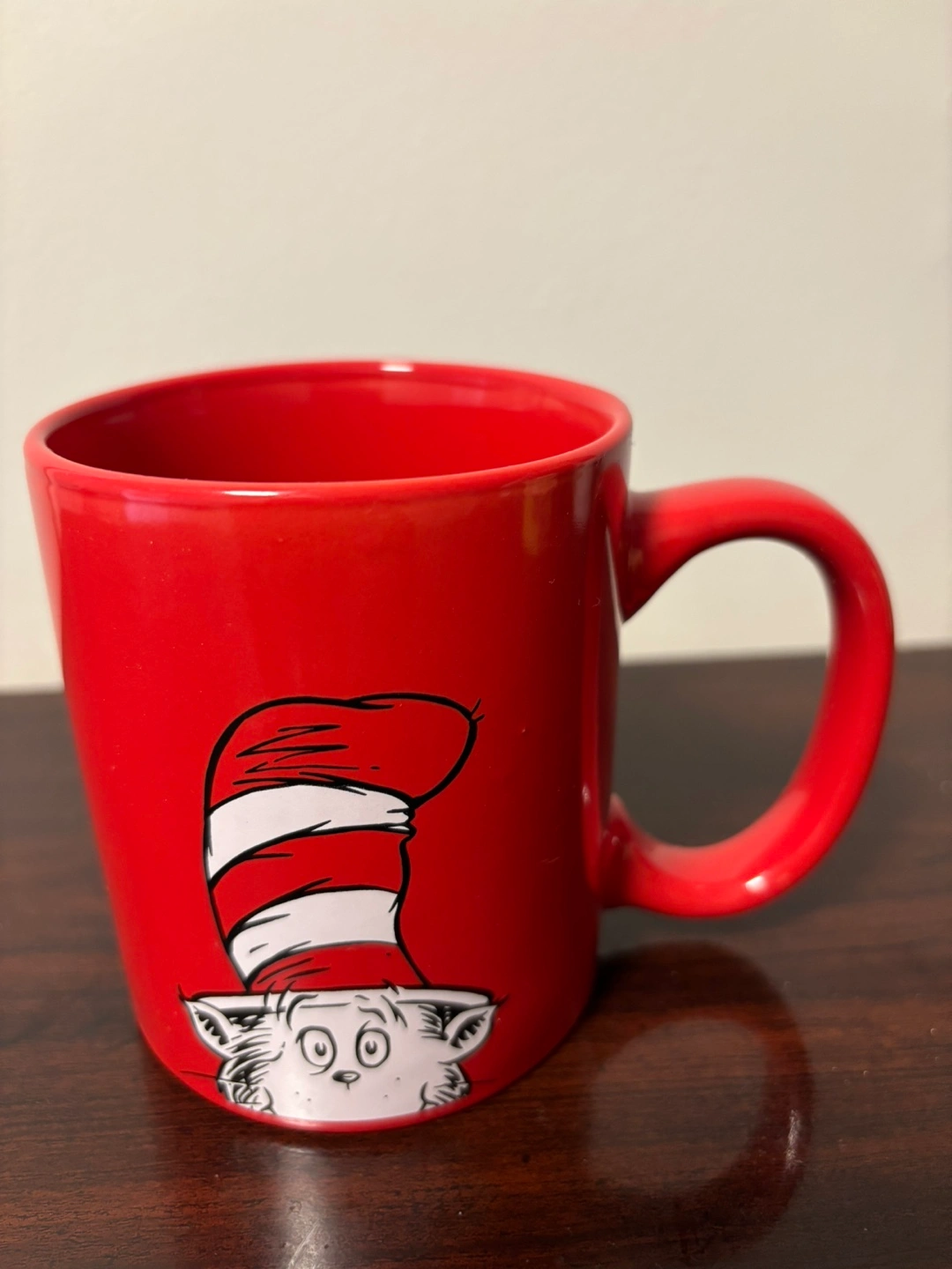 Red ceramic mug. Features Cat in the Hat peeking over the top. Great for coffee or tea. Perfect for fans of Dr. Seuss.