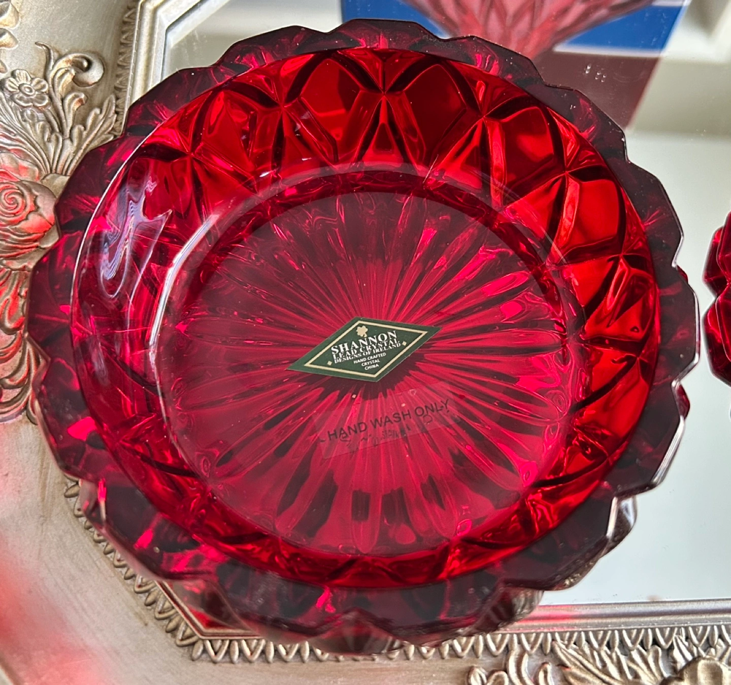 Gorgeous ruby red crystal candy dish. Features a unique Hershey's Kisses design. Hand wash only. Comes in original box. 5”X 5”X 5” 😊