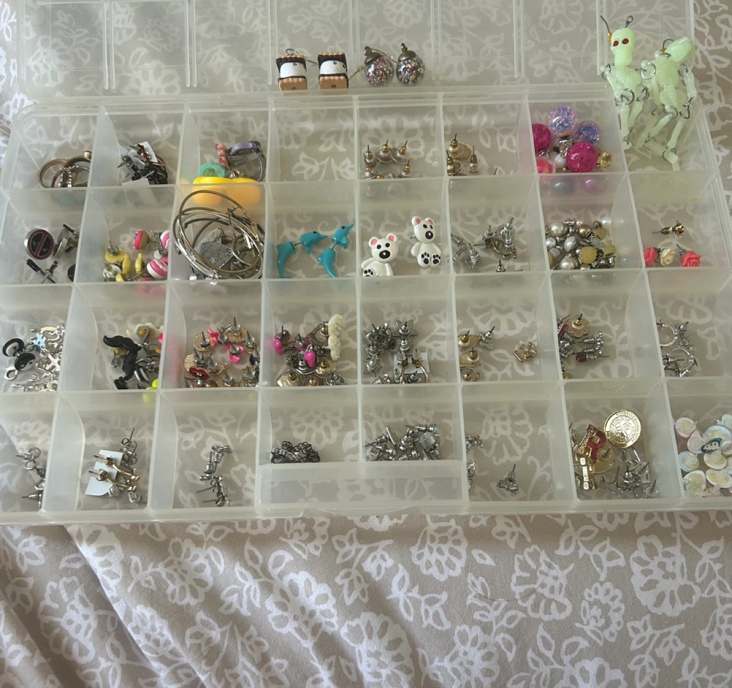 This is a huge collection of earrings for kids and teens. Most have never been worn. The set also includes some random pieces like rings and alphabet pendants. The set also includes the dangly skeleton earrings pictured! Box is included in the sale. Message me for more detailed pictures <3