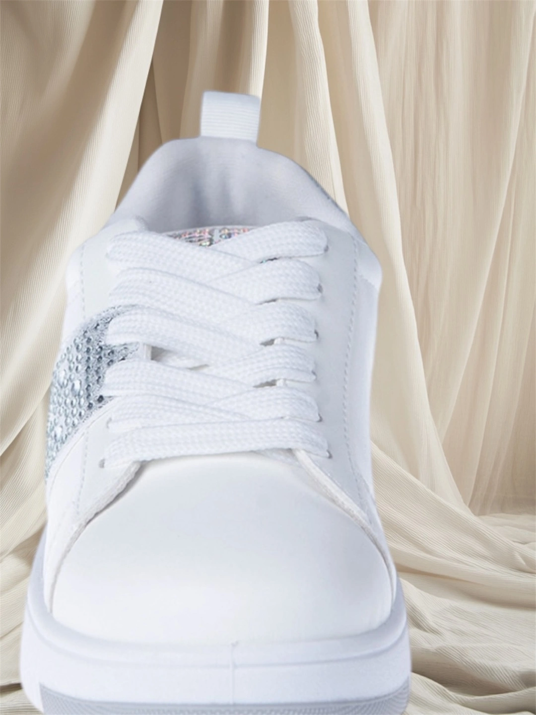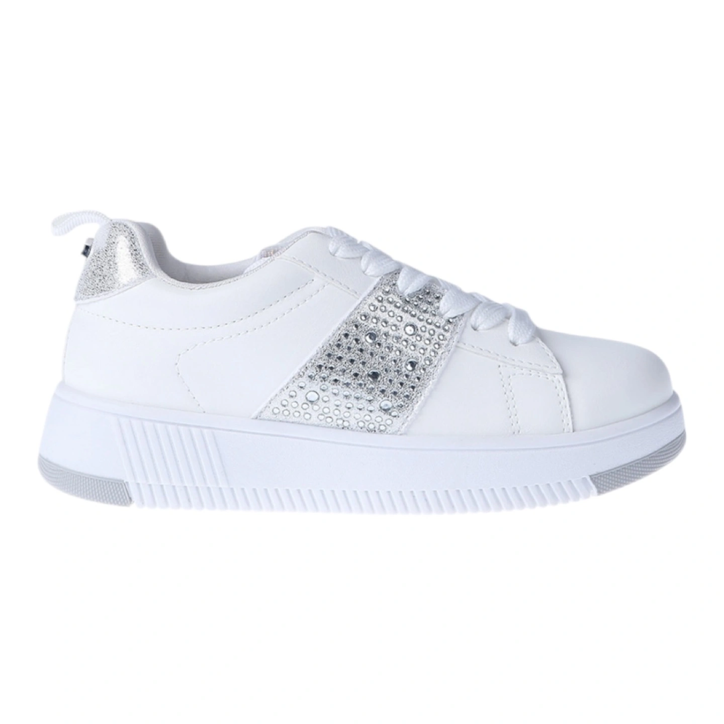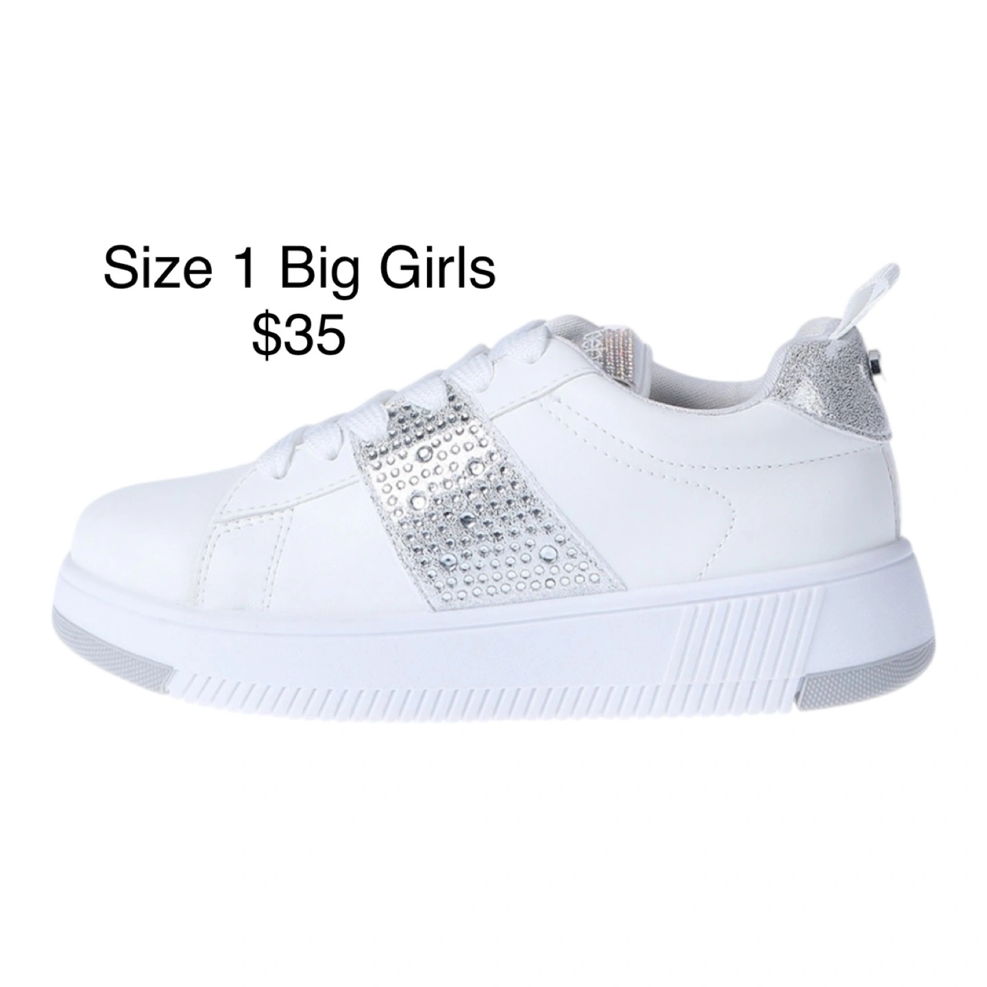 White leather sneakers. Size 1 big girls. Rhinestone accents. Platform sole. Lace-up closure.