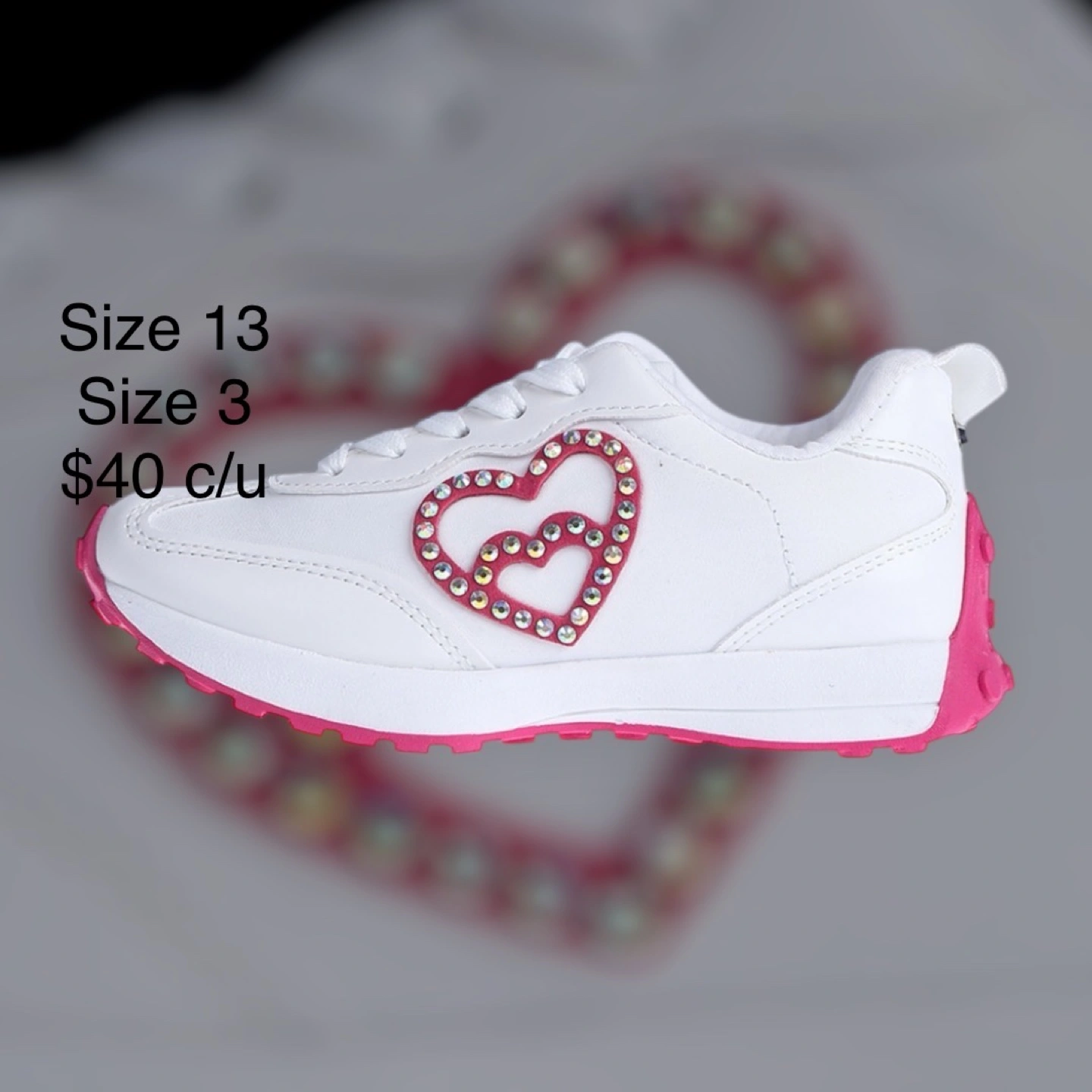 Adorable girls' sneakers. White leather-like upper, pink accents, and a sparkly heart detail. Great for everyday wear. Size 13, also marked as a size 3.