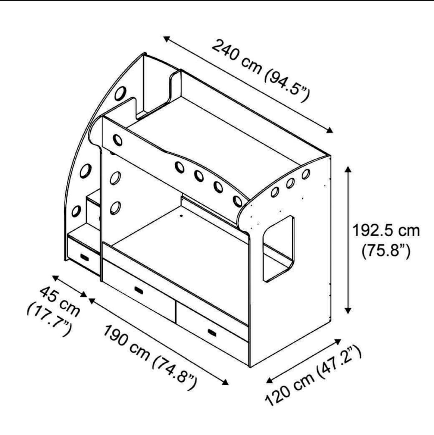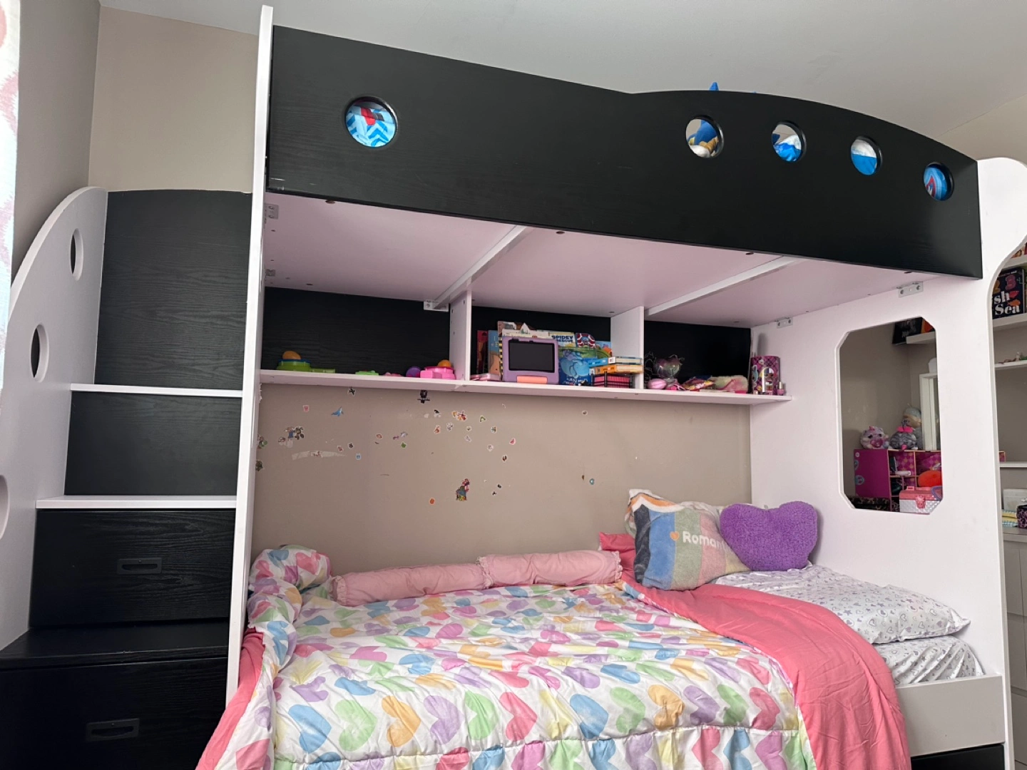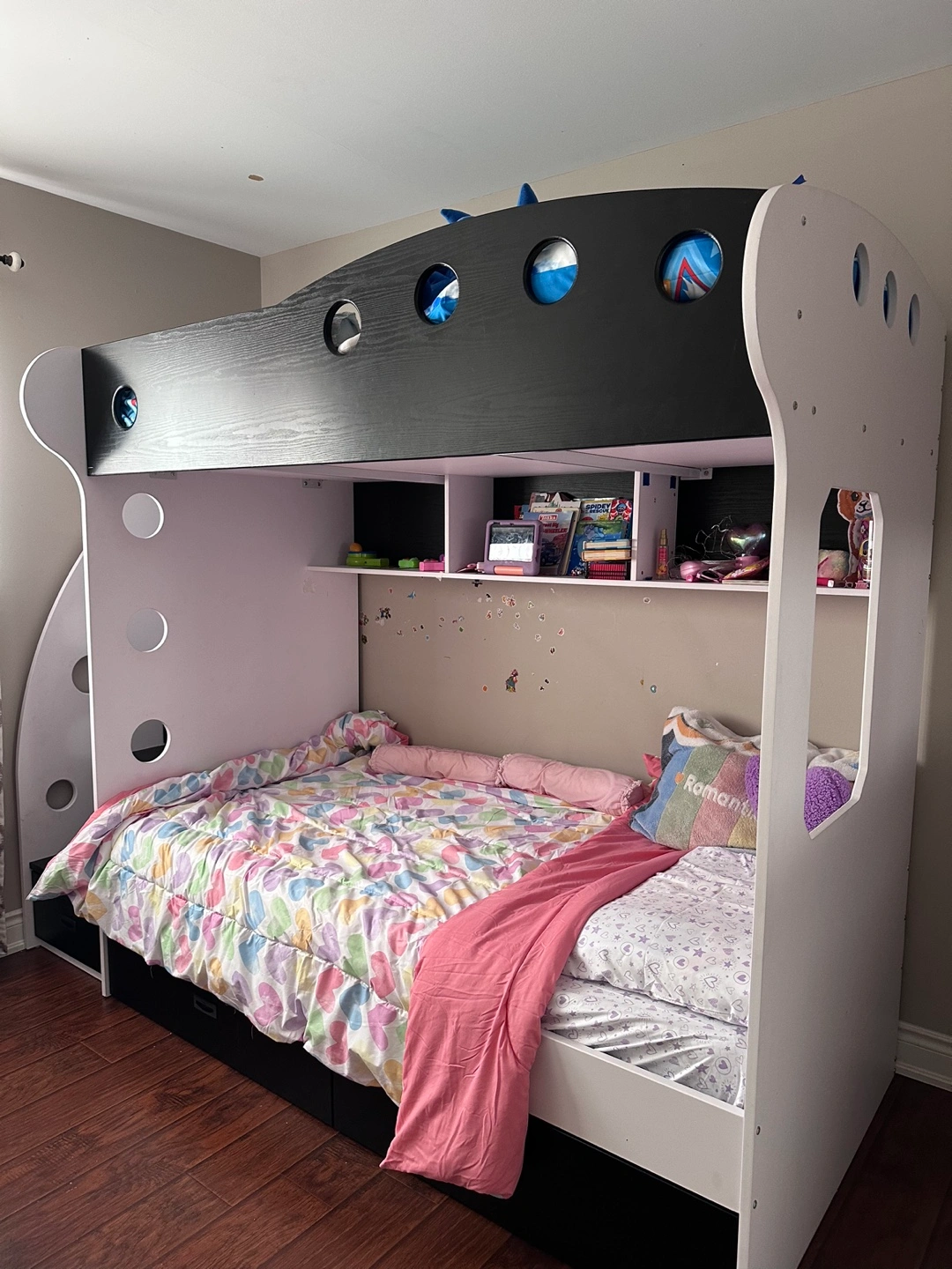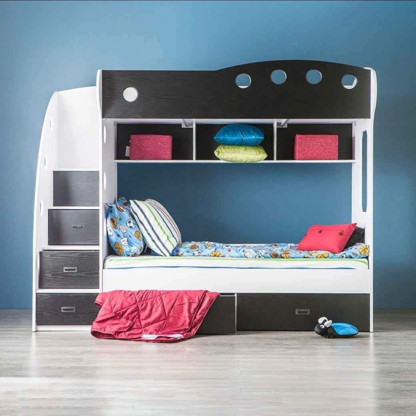 Twin over twin bunk bed. Black and white colour scheme. Built-in storage including drawers and shelves.