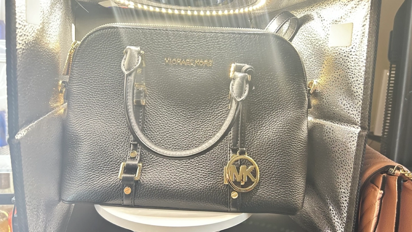 Black leather dome satchel. Gold hardware accents. Includes dust bag. Adjustable strap.