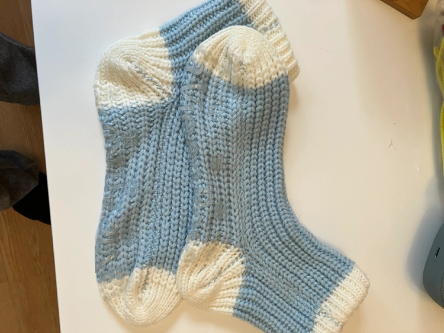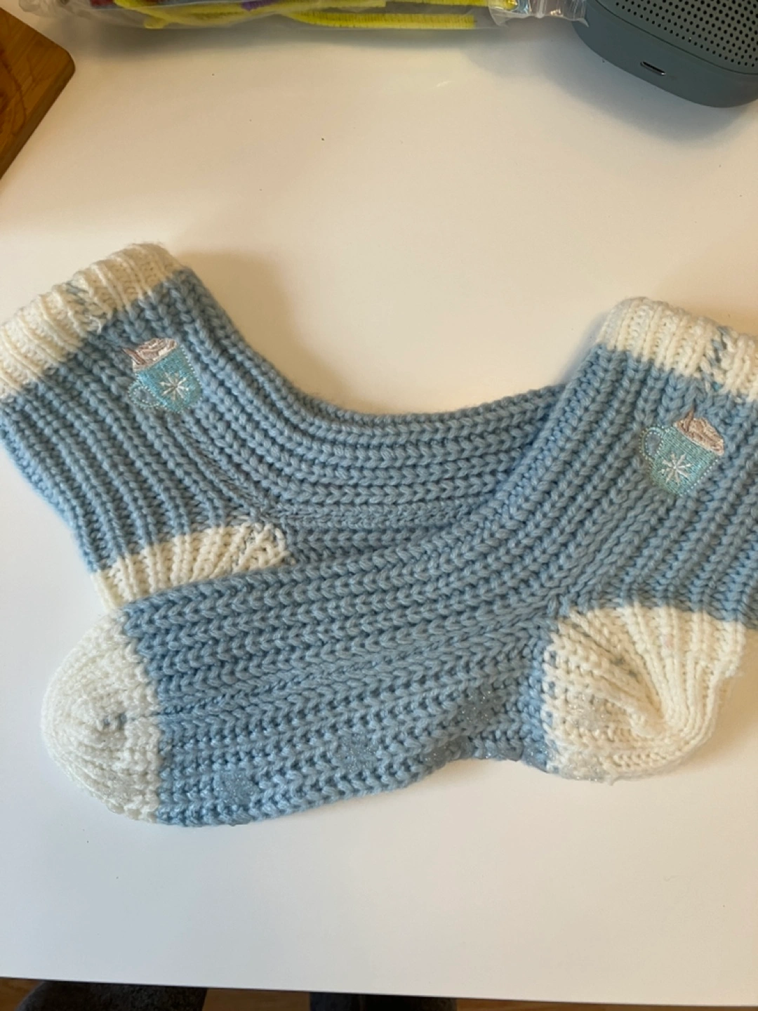 Brand new knitted socks, light blue with white. Features embroidered hot beverage design and tread on the bottom with a snowflake and “la vie en rose” logo. Cozy and warm for chilly evenings!