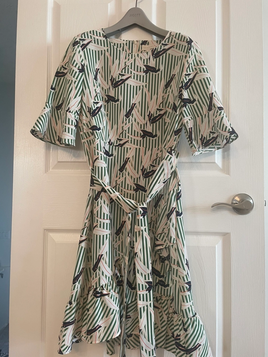 Cute summer dress. Features a green and white striped pattern, leaf print, short sleeves, and a tie waist. Falls to just above the knee. Back zip closure hidden in the seam. Nylon 20% viscose rayon 80%.