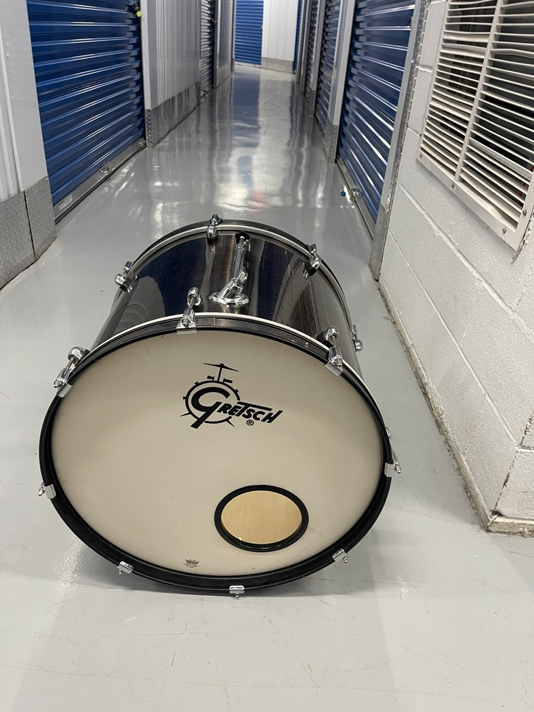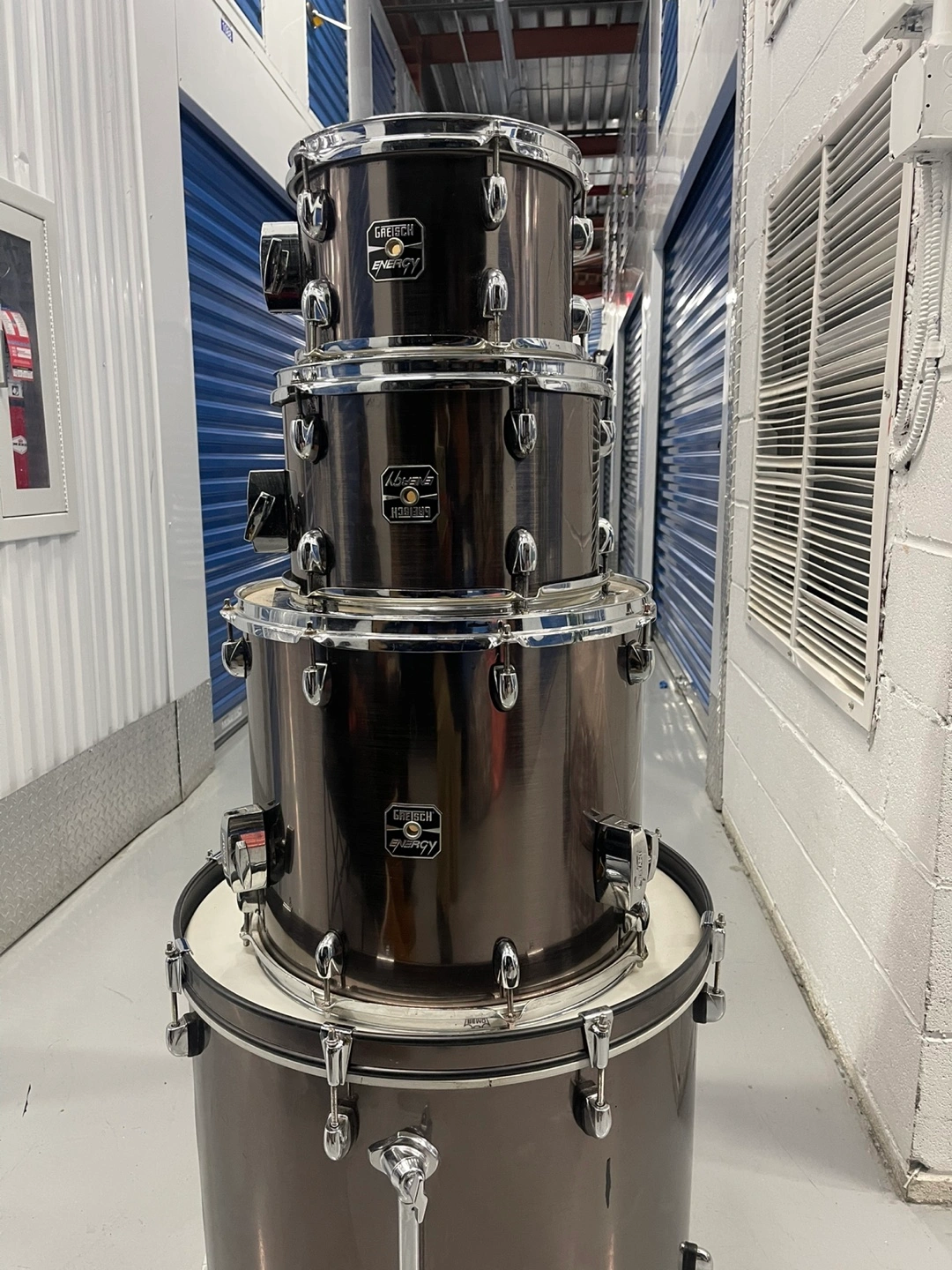 Used Gretsch Catalina Club Jazz drum set. Includes bass drum, snare drum, and toms. Gunmetal finish. Minor wear.