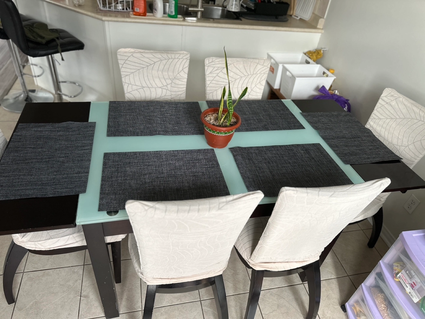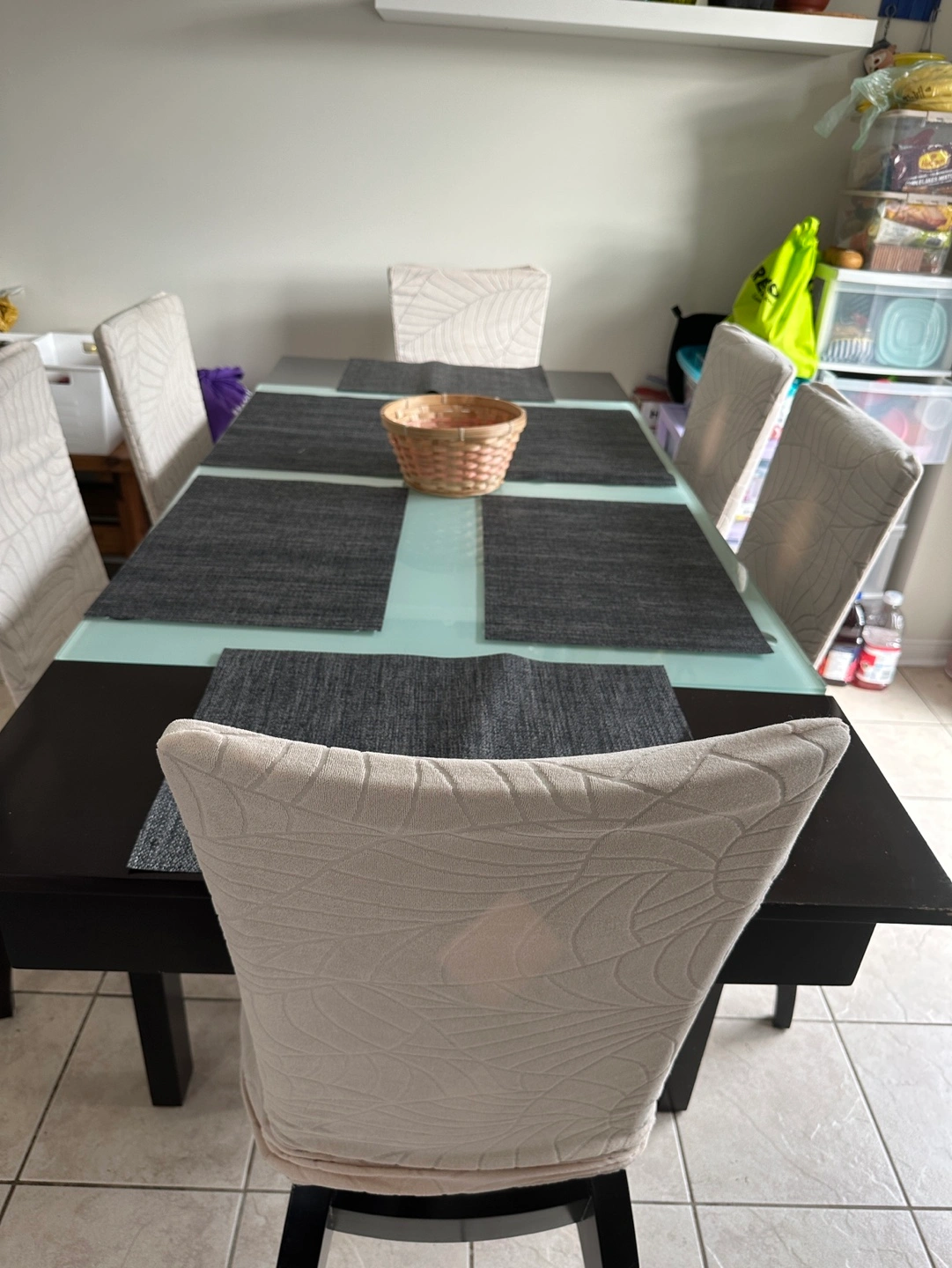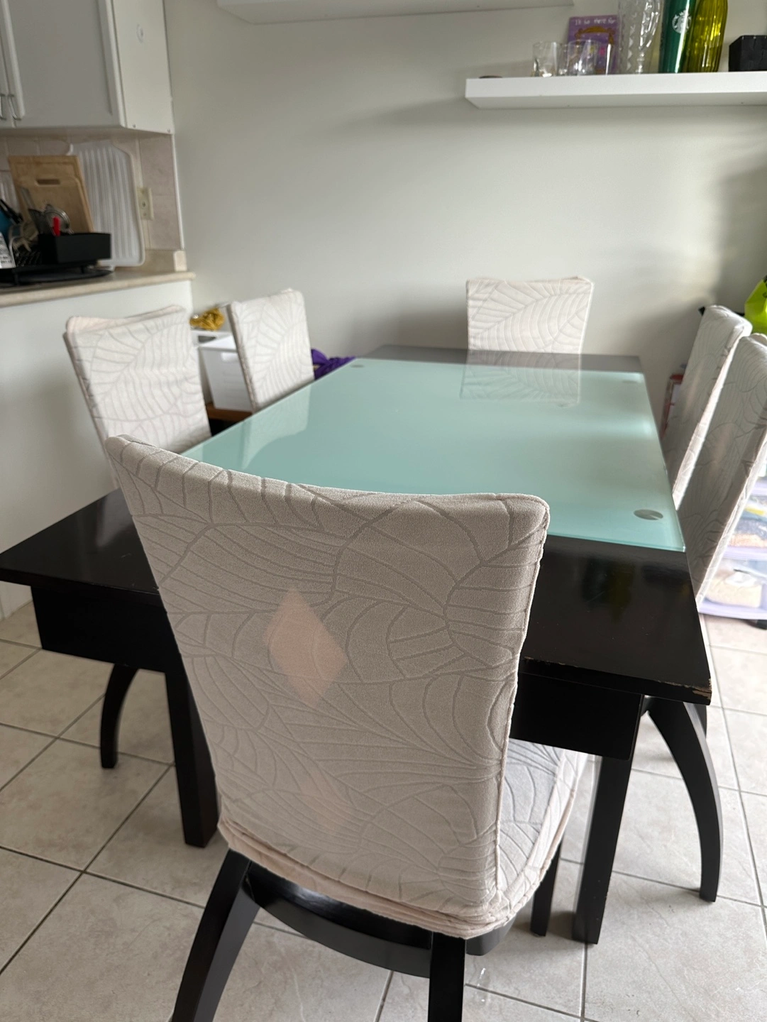 Sleek dining set. Features a frosted glass top and dark brown wooden base. Six included chairs have beige fabric covers. Minimal assembly required.