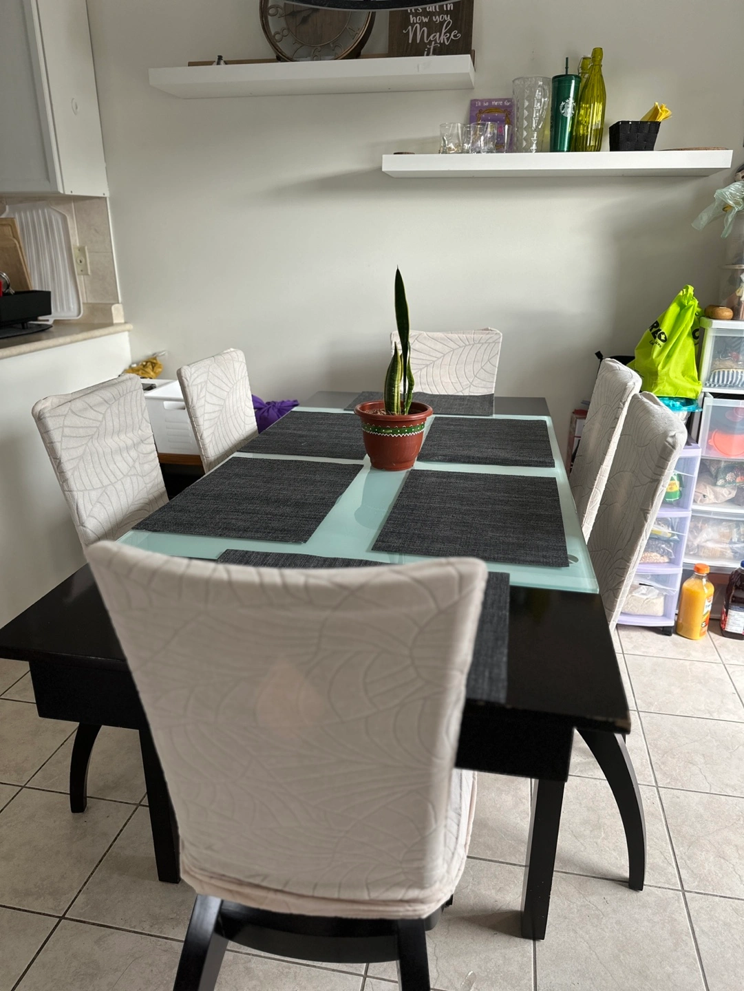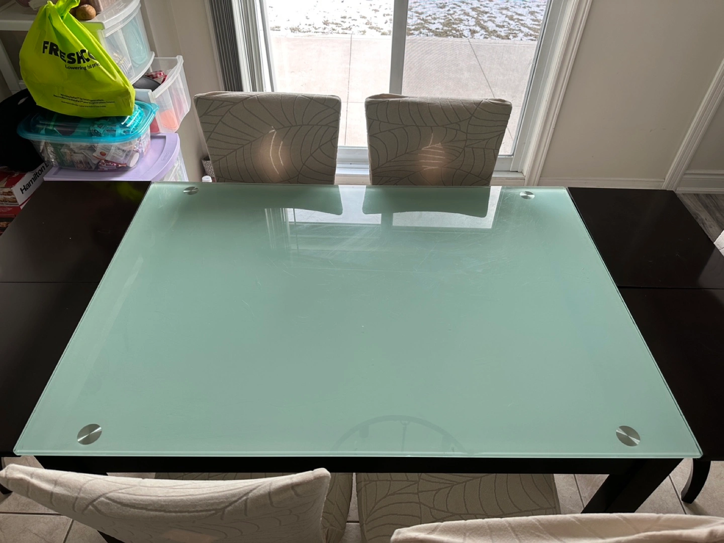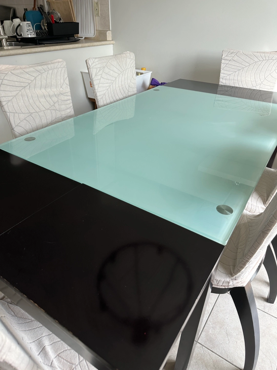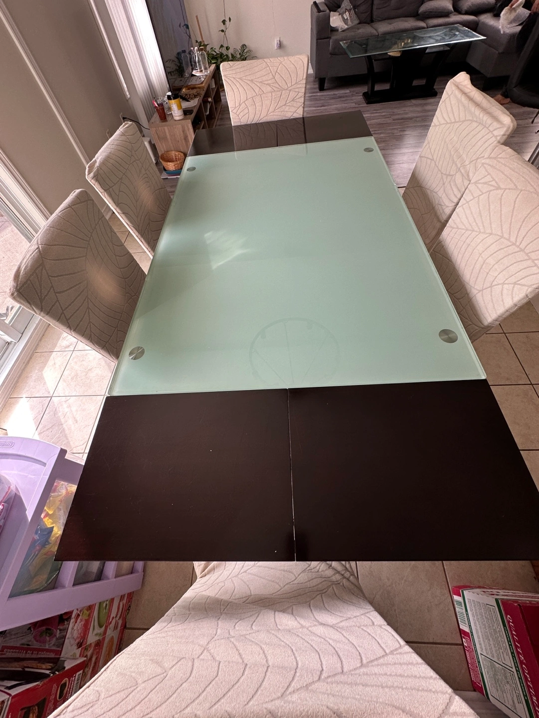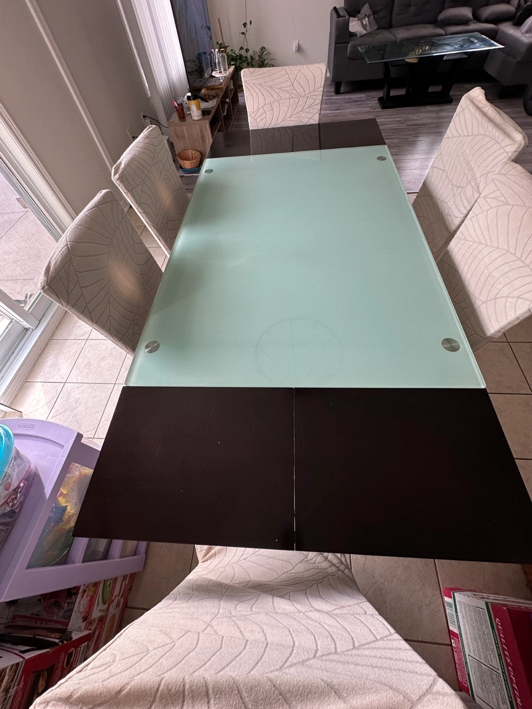 - Wooden/Glass Extendable dining table with 6 chairs.