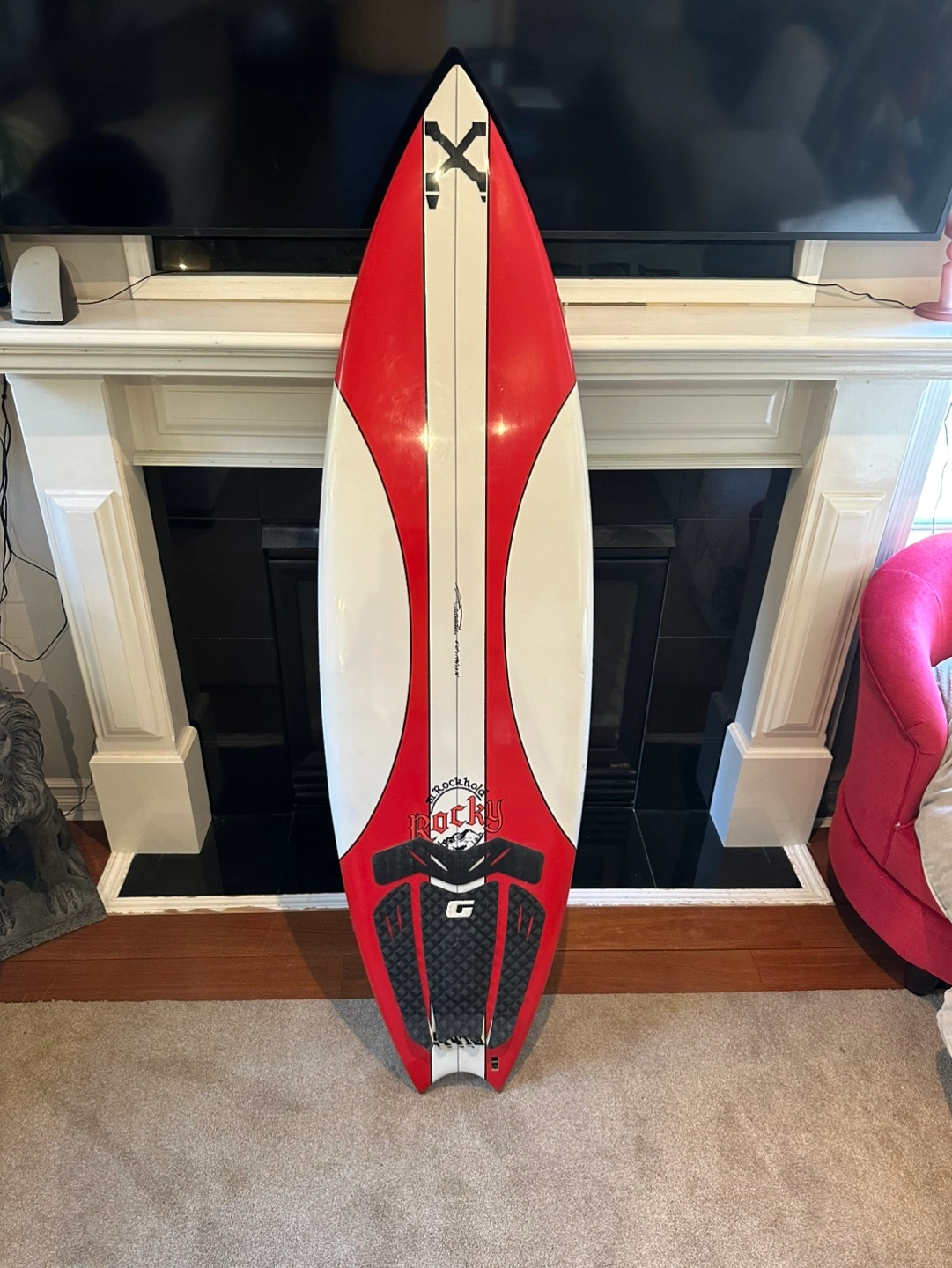 Used surfboard. Red and white. Three fins. Features Rockhold logo and Rocky model designation. Good condition.