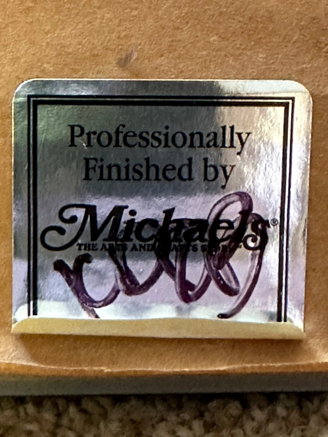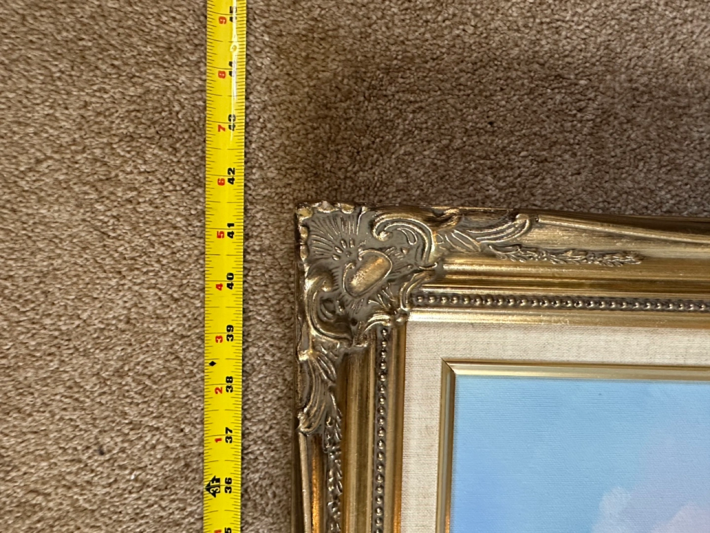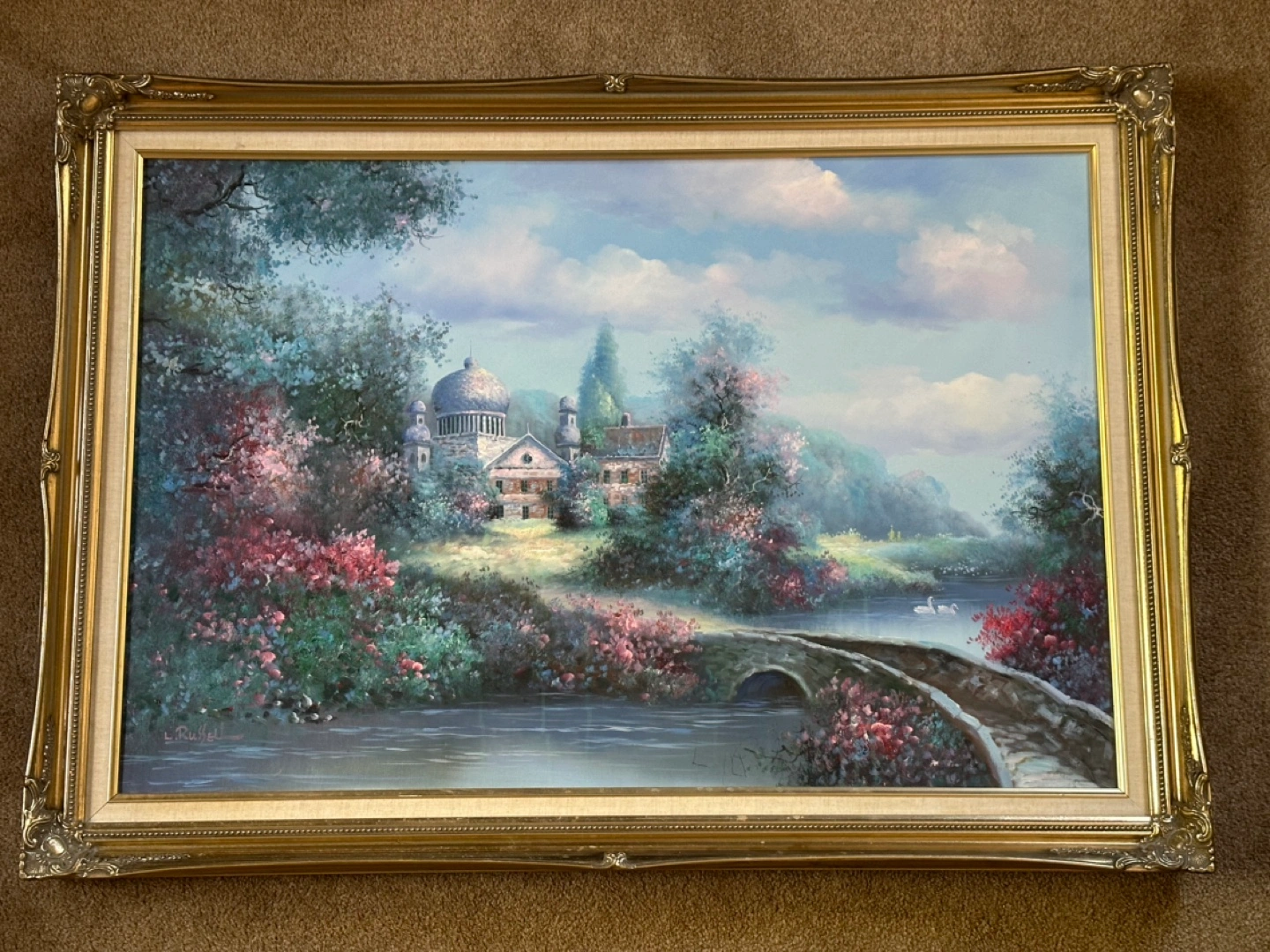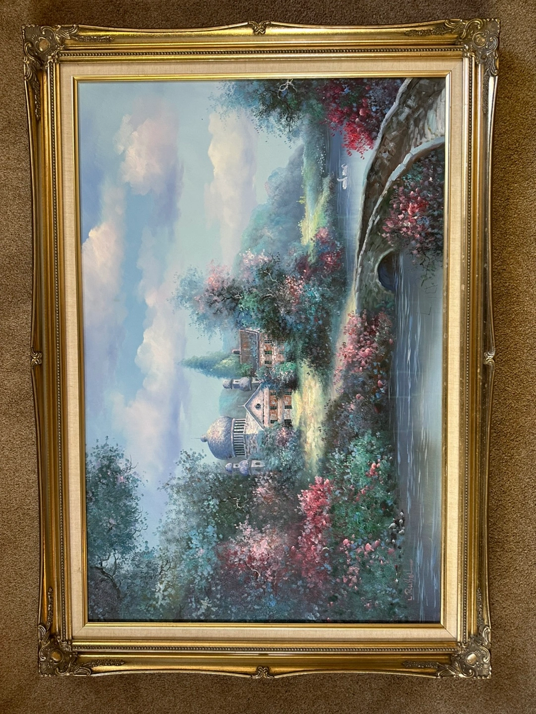 Beautiful landscape painting, framed. Features a tranquil scene with a building and bridge. Artist signature visible. Gold ornate coloured frame.
