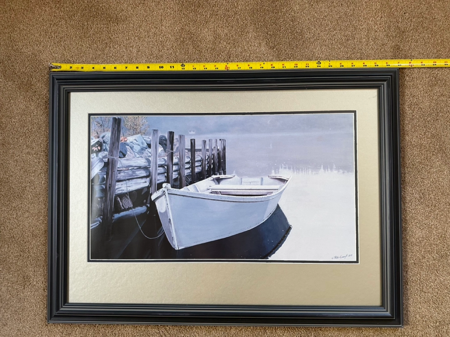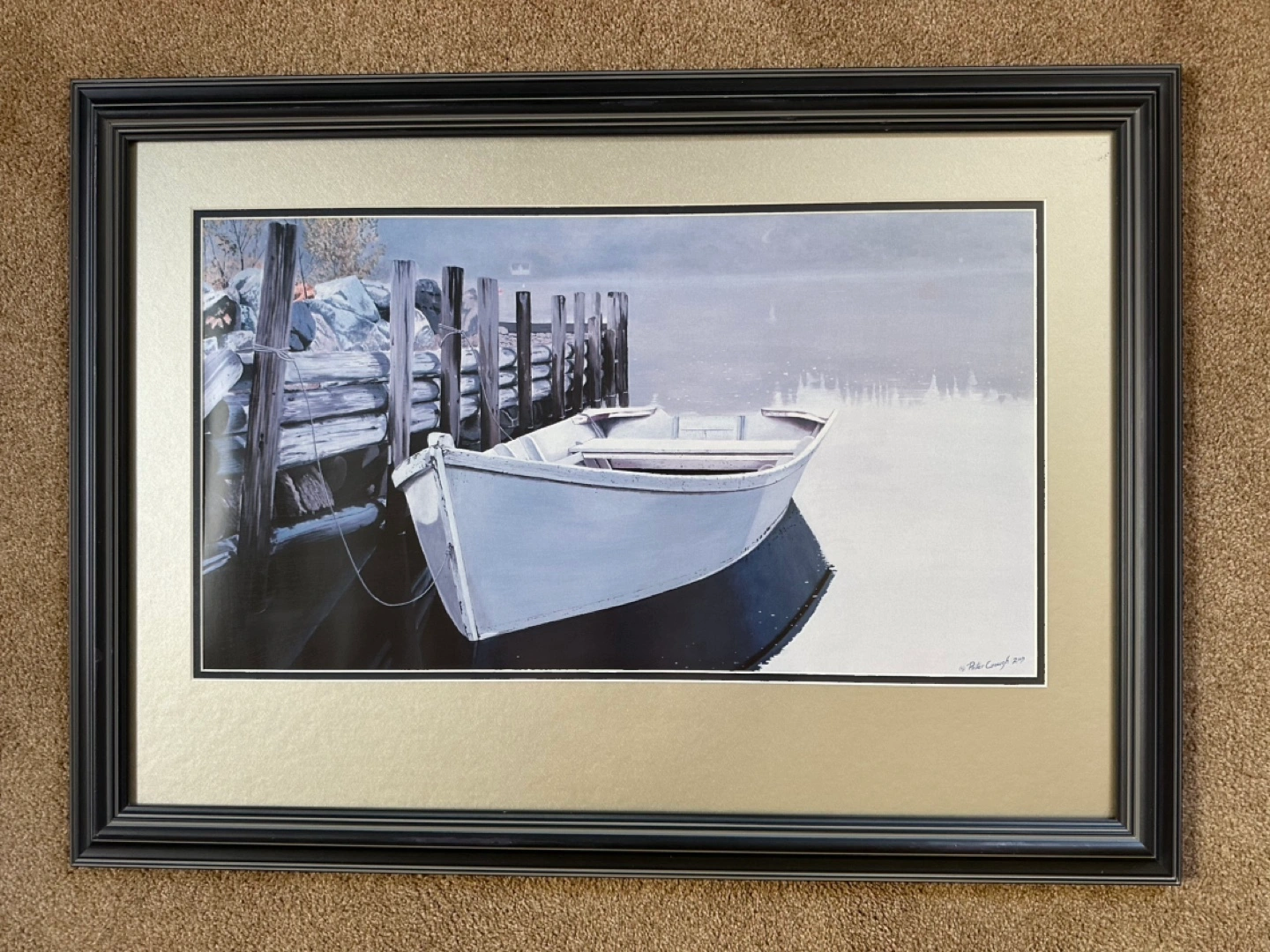 Beautiful framed print of a boat at a dock. Black frame with silver matting. Artist signature visible.