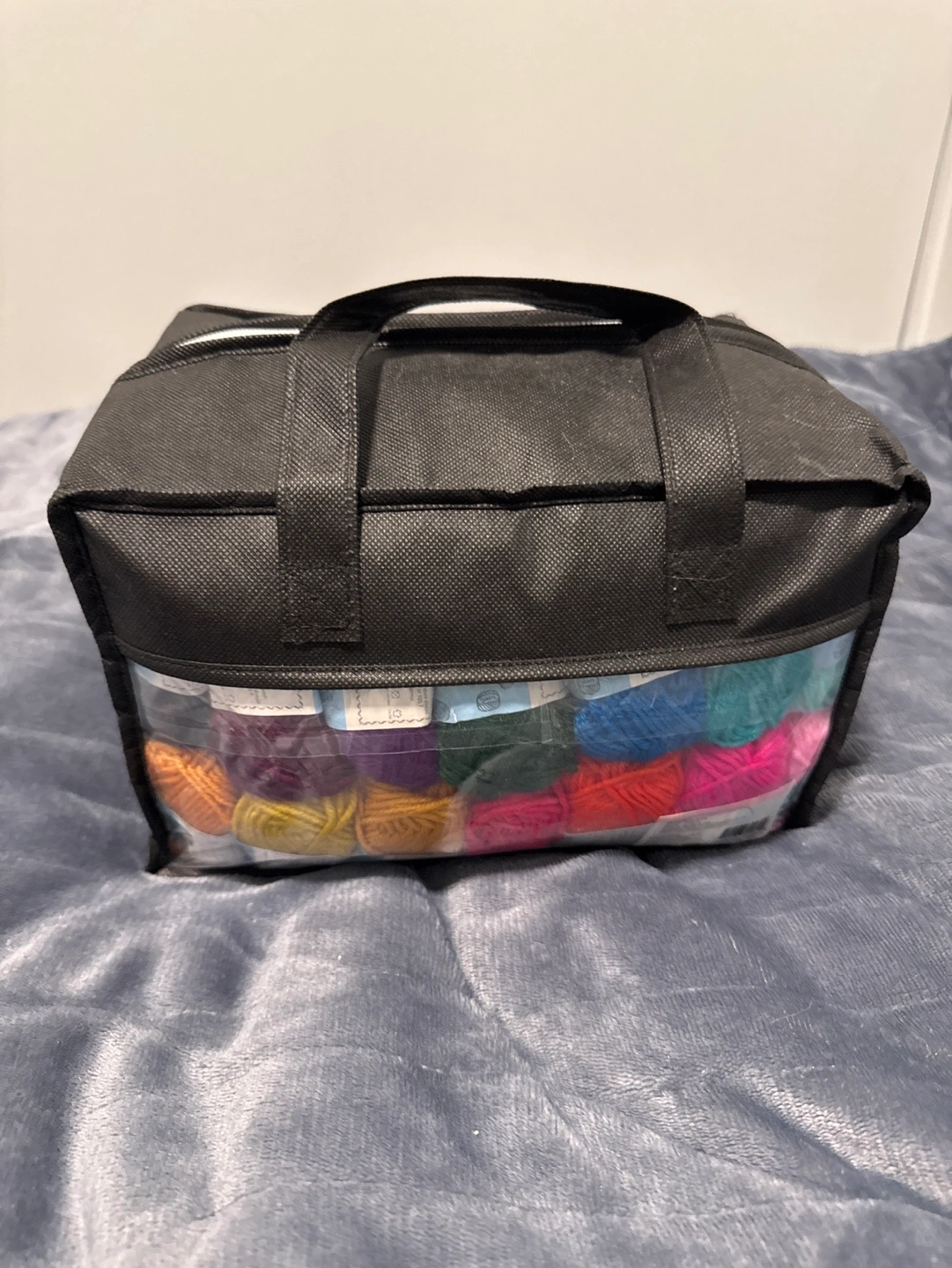 Black non-woven fabric storage bag with two handles. Contains various colours of yarn. Clear plastic window allows yarn visibility.