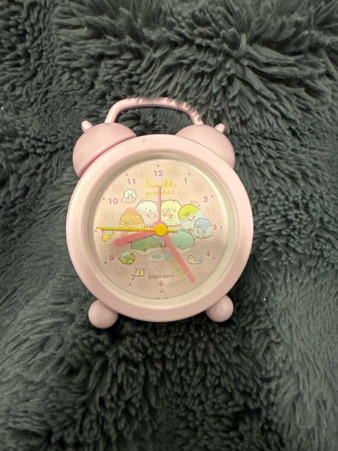 161Adorable pink alarm clock. Features Sumikko Gurashi characters. Compact size.