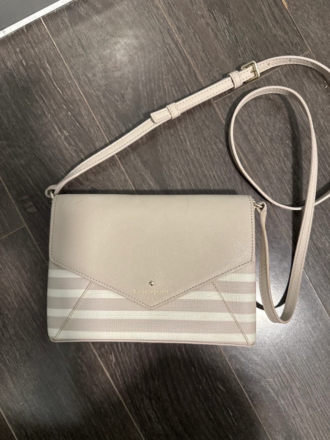 161Adorable crossbody bag. Features beige and white stripes. Adjustable strap. Excellent for everyday use.