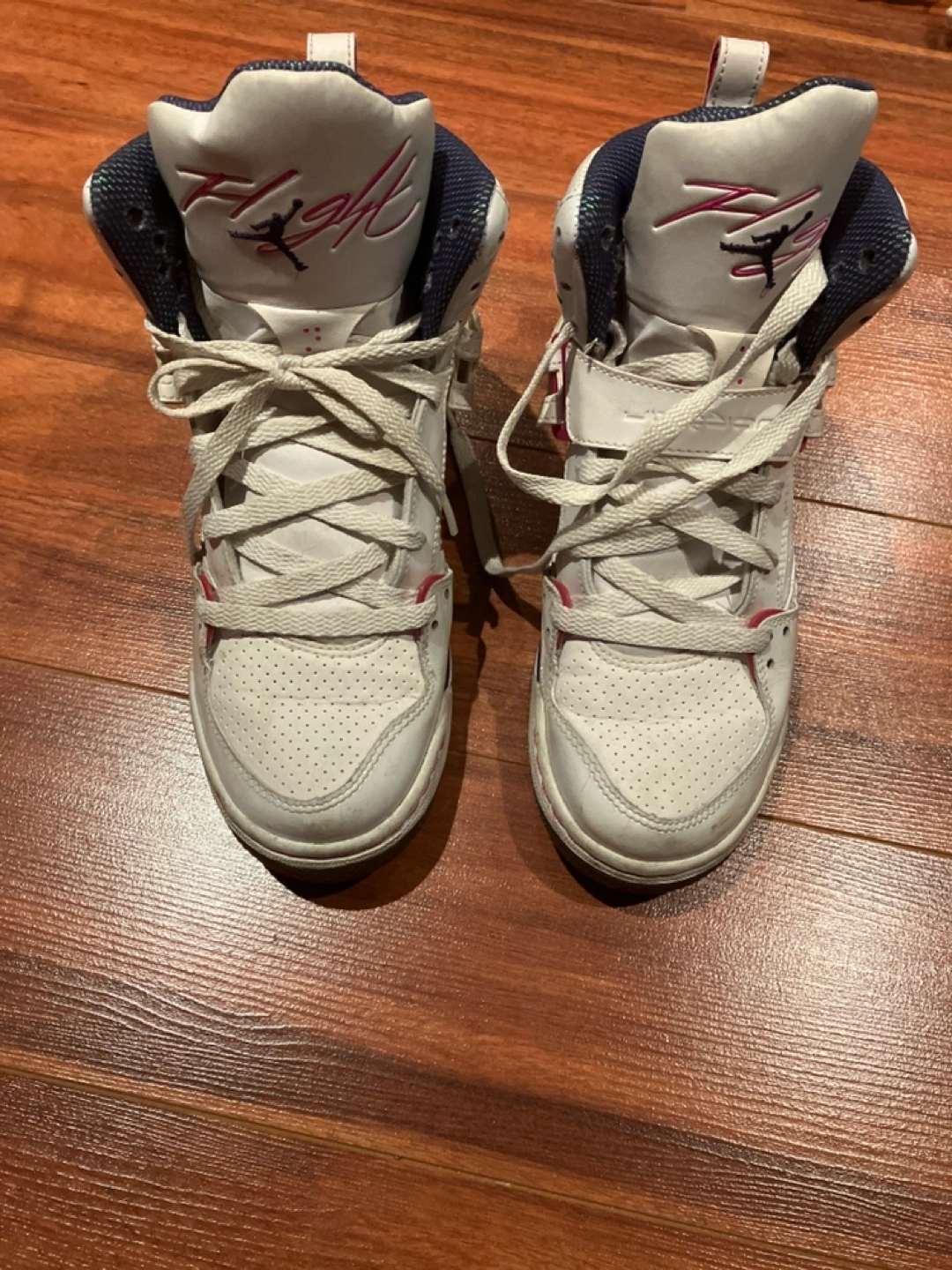 Pre-owned girl's high-top sneakers. White leather upper with navy blue and pink accents. Lace-up closure. Minor wear. Size 6Y.