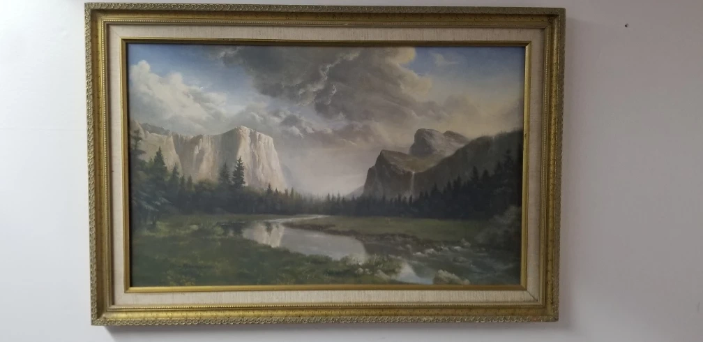 Vintage 1989 Dino Massaroni Beautiful framed landscape Print. Depicts Yosemite Valley. Gold coloured frame. Minor wear consistent with age. Includes a Continental Fine Art Gallery sticker on the back.