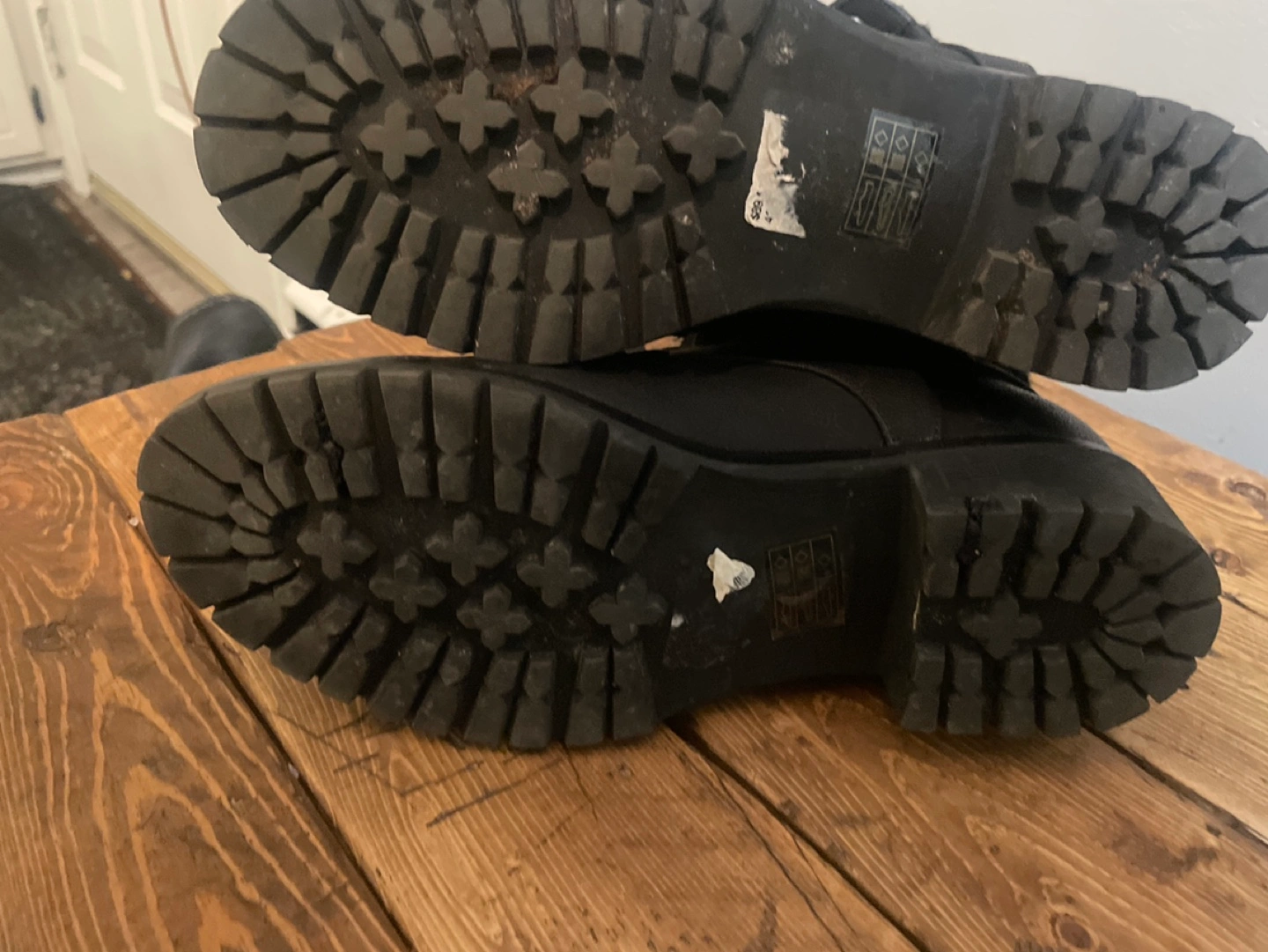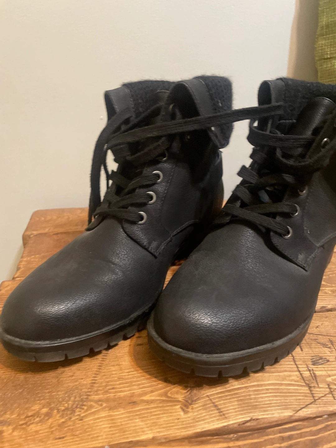 15Pair of black women's winter boots. Lace-up design. Faux leather material. Warm fleece lining. Durable rubber sole. Great for cold weather.