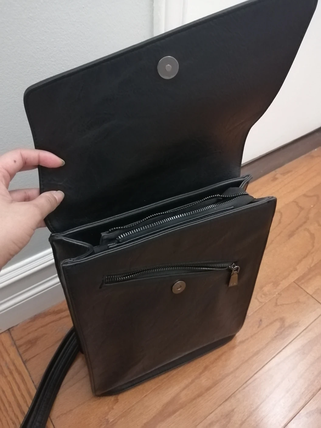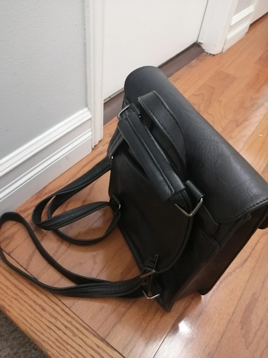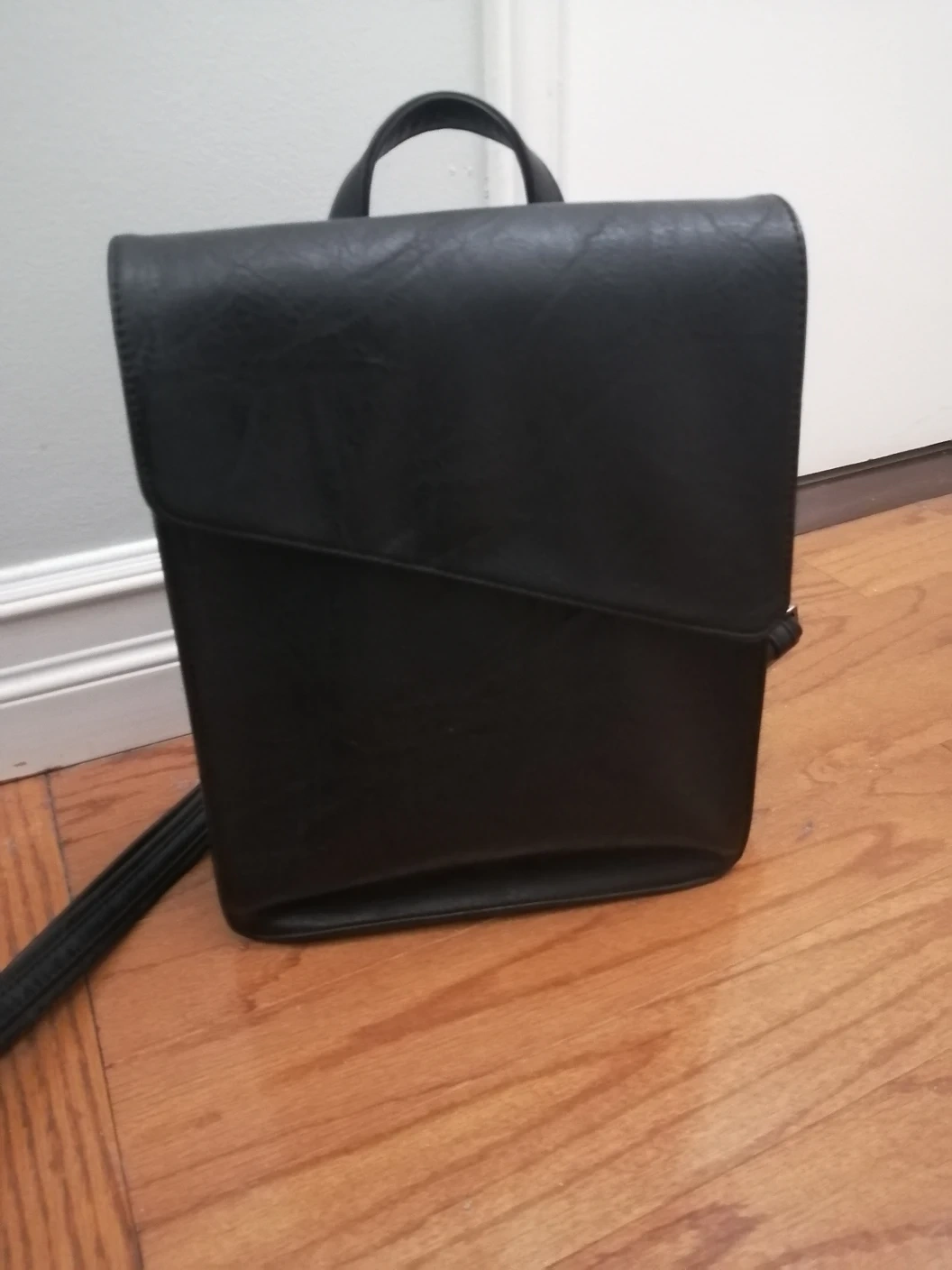 Small black backpack purse. Features adjustable straps, zipper closure, and a flap with magnetic closure. Multiple pockets. Suitable for everyday use.
