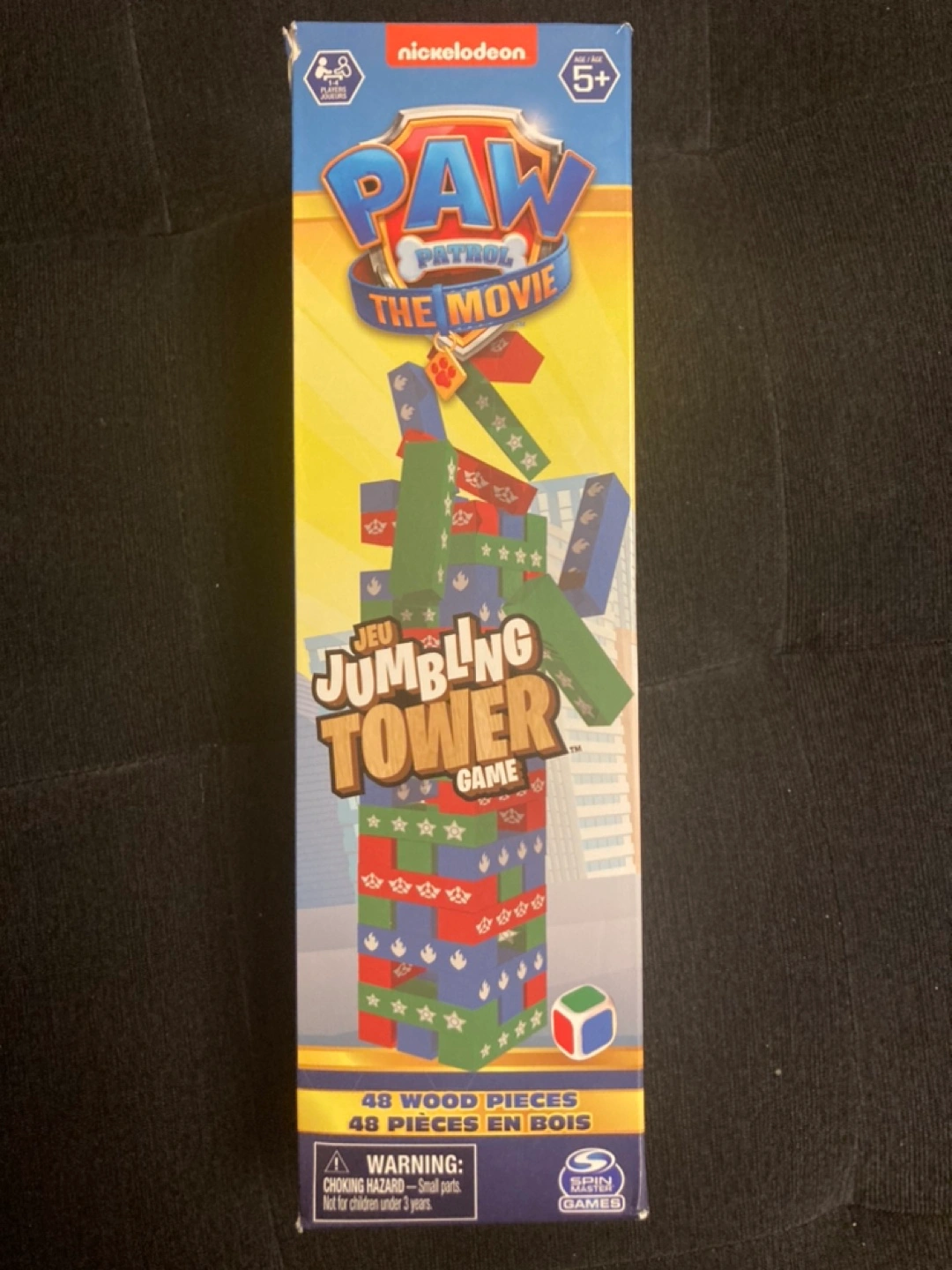 Paw Patrol Jumbling Tower game. 48 wooden pieces plus a dice. Ages 5+. Fun for the whole family.