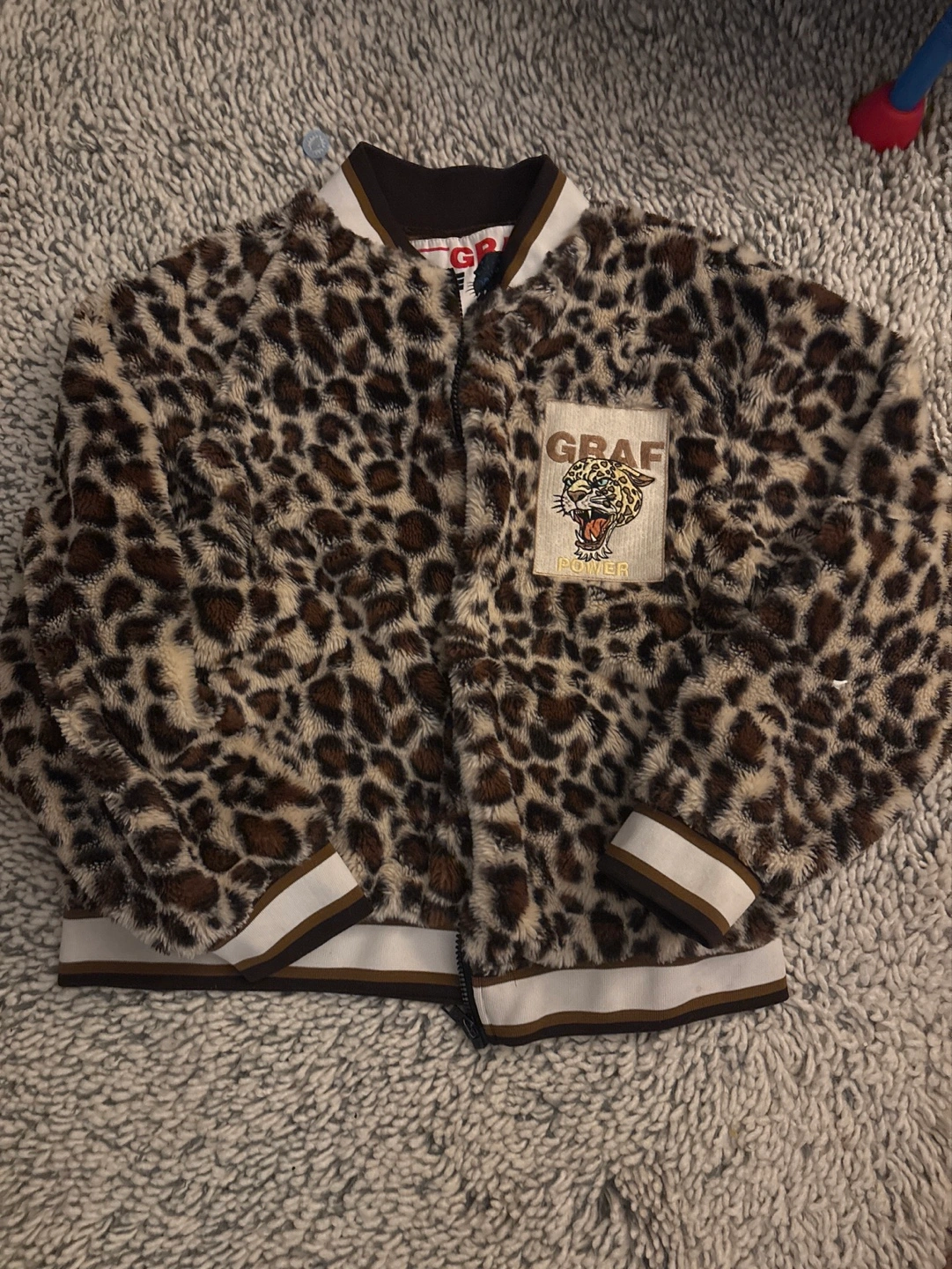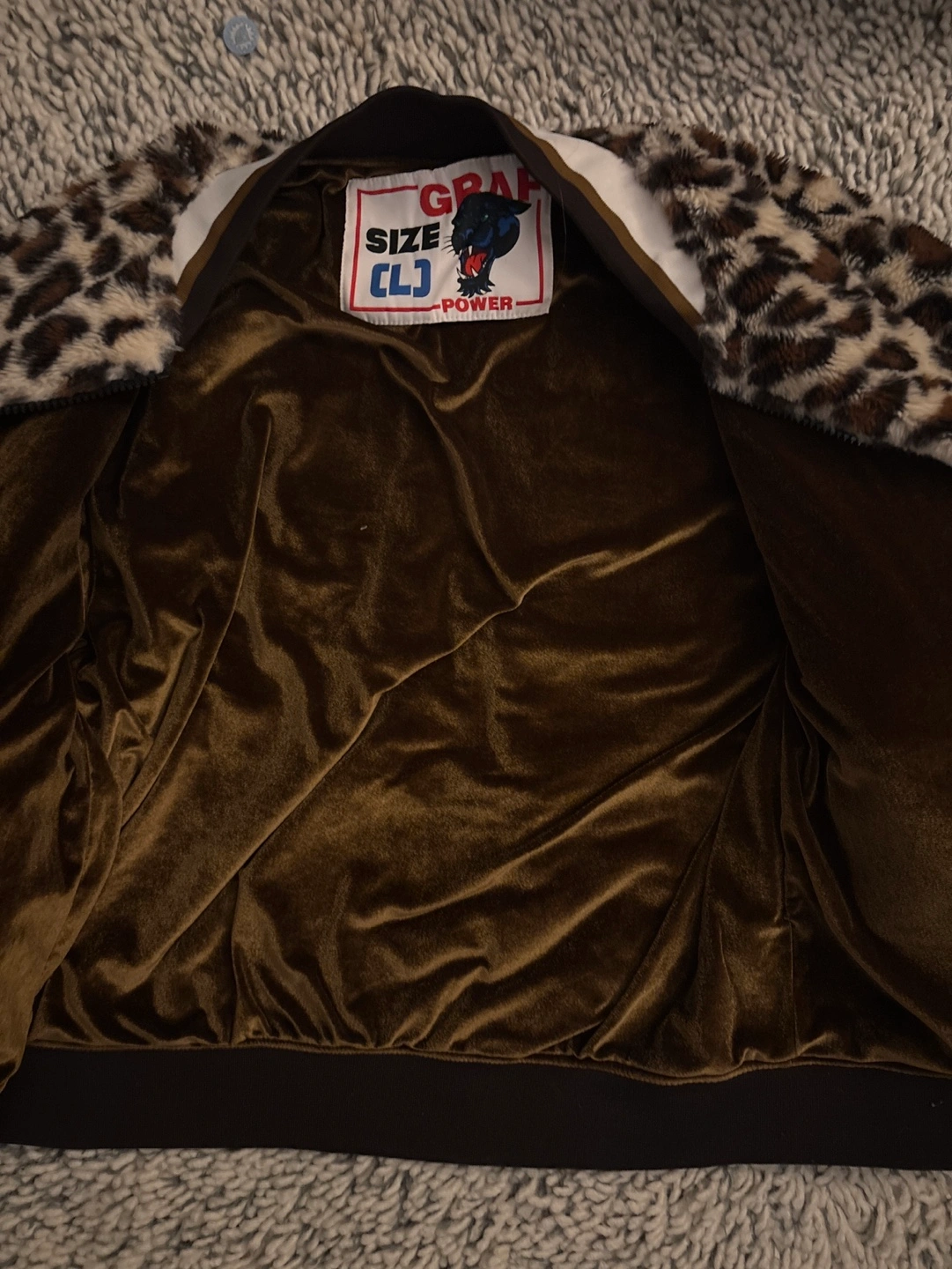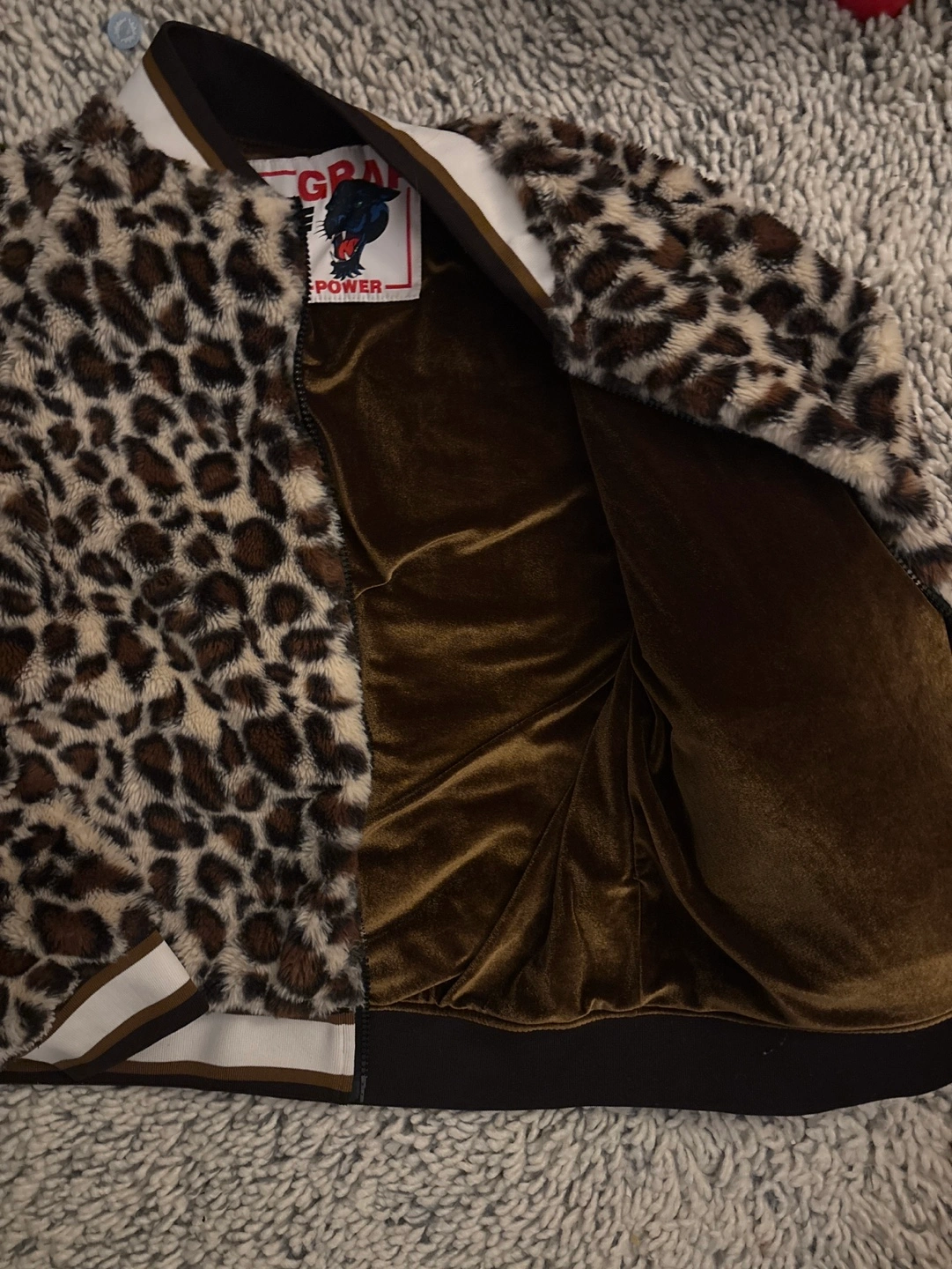 Fuzzy leopard print jacket. Brown, cream, and black print. Brown velvet lining. White and brown ribbed trim. Zip front closure. Graf Power logo patch.