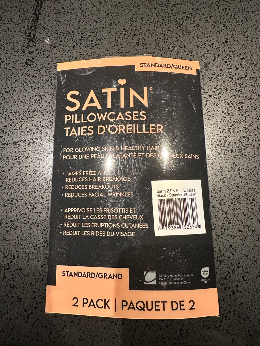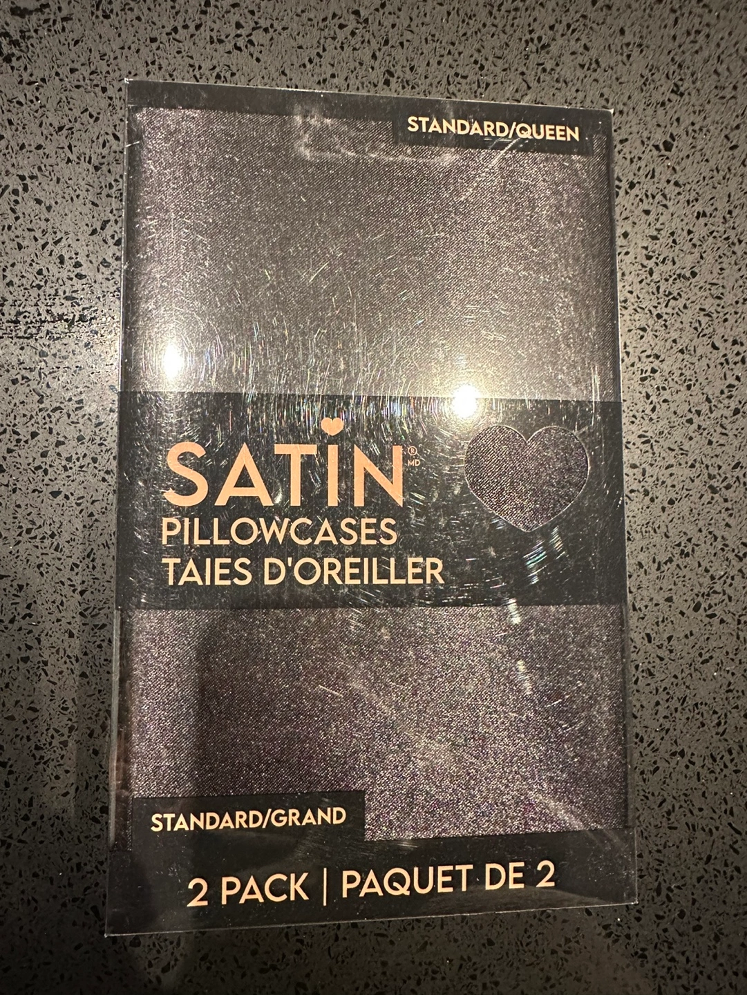 Brand new in box. New satin pillowcases, 2 pack. Standard/Queen size. Reduces frizz and breakouts. For glowing skin and healthy hair.